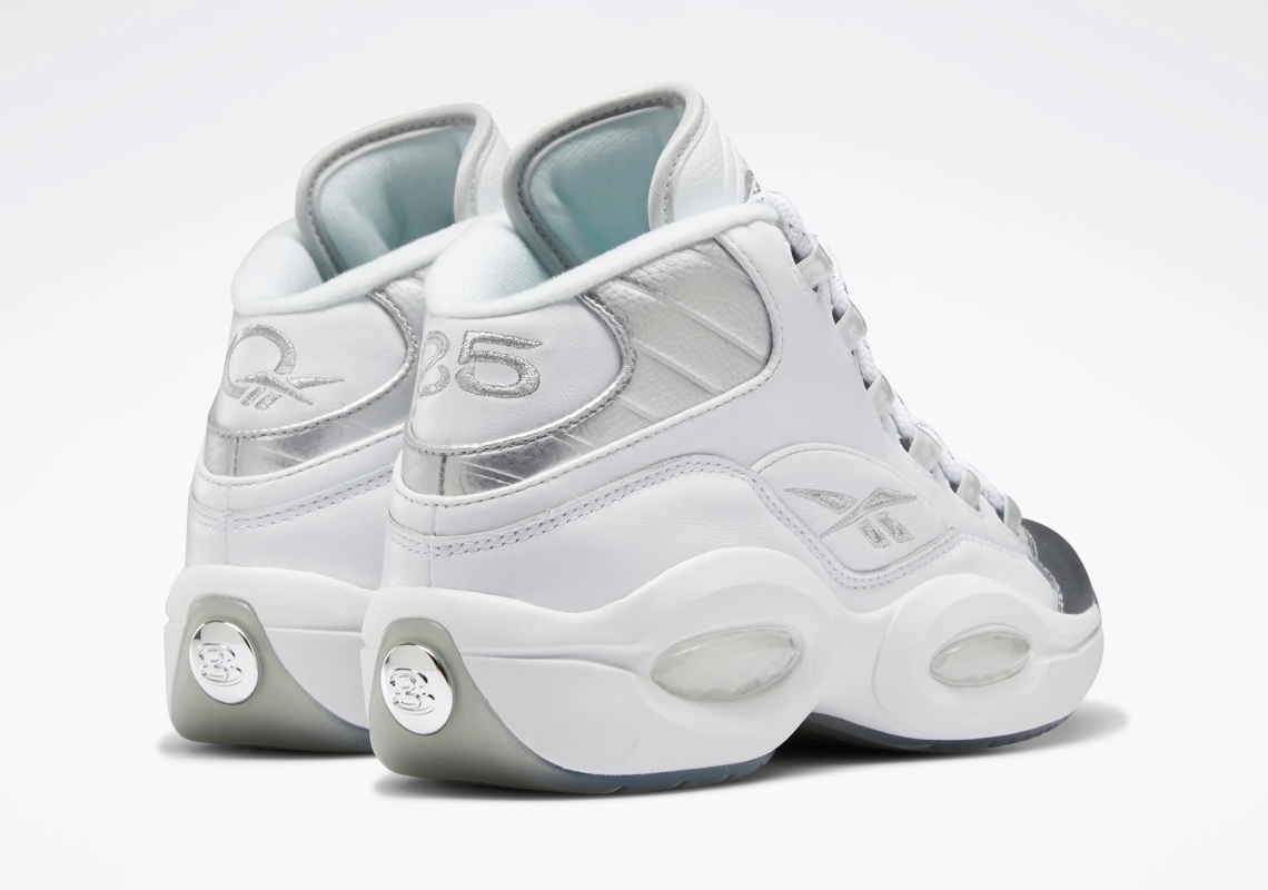 Sur une tige blanche, les parties en argent se trouvent sur l’avant de la chaussure en daim, les logos Reebok et 25 sur l’empeigne, la languette et le talon ainsi que sur une bande au niveau de la cheville. Le numéro 3 d’Allen Iverson ressort également en argenté au niveau du talon sur la semelle extérieure glacée.