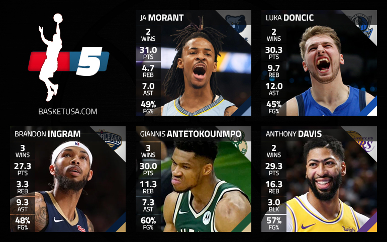 Sur les ailes, pas mal de candidats avec DeMar DeRozan, Pascal Siakam, Jimmy Butler, Jaylen Brown ou Jaren Jackson Jr. mais Giannis Antetokounmpo est quasiment parfait sur la semaine, alors que Brandon Ingram est performant et plus passeur que jamais, pour des Pelicans qui sont remontés dans le Top 10 à l’Ouest.