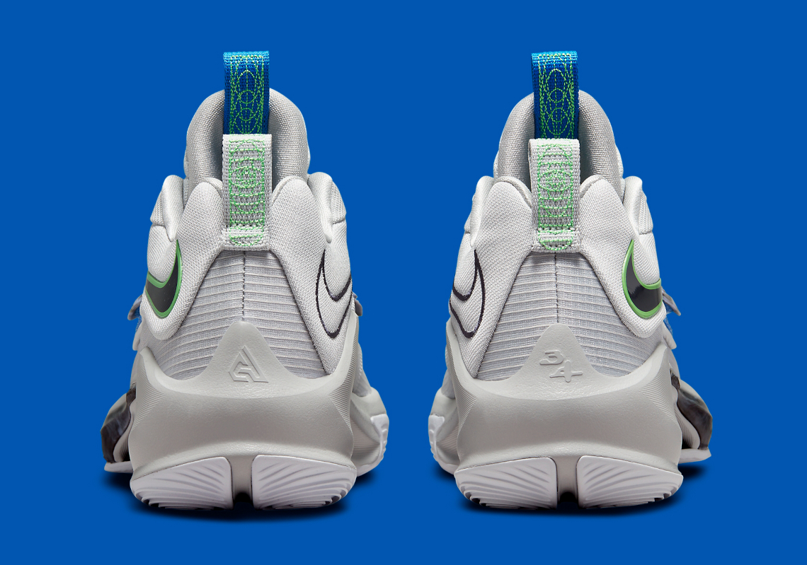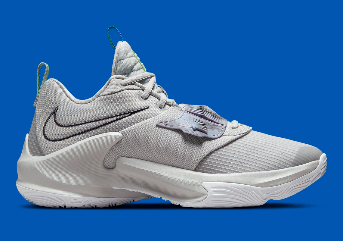 Tout récemment passée au crible par BasketUSA, la Zoom Freak 3 va d’ailleurs bénéficier de quelques nouveaux coloris en 2022, dont ce modèle blanc cassé doté de pointes de vert sur les logos présents sur la languette ou sur les contours du “Swoosh” inversé, en noir.