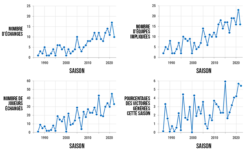 D’après Todd Whitehead, la NBA a ainsi enregistré 10 transferts le 10 février, avec 16 équipes impliquées et 33 joueurs qui ont changé de maillot, eux qui représentaient 5.4% des victoires générées cette saison. C’est moins que l’an passé, mais l’intensité de la “trade deadline” est globalement en hausse depuis plusieurs saisons.