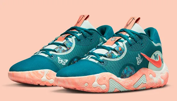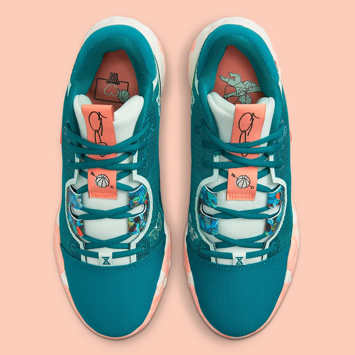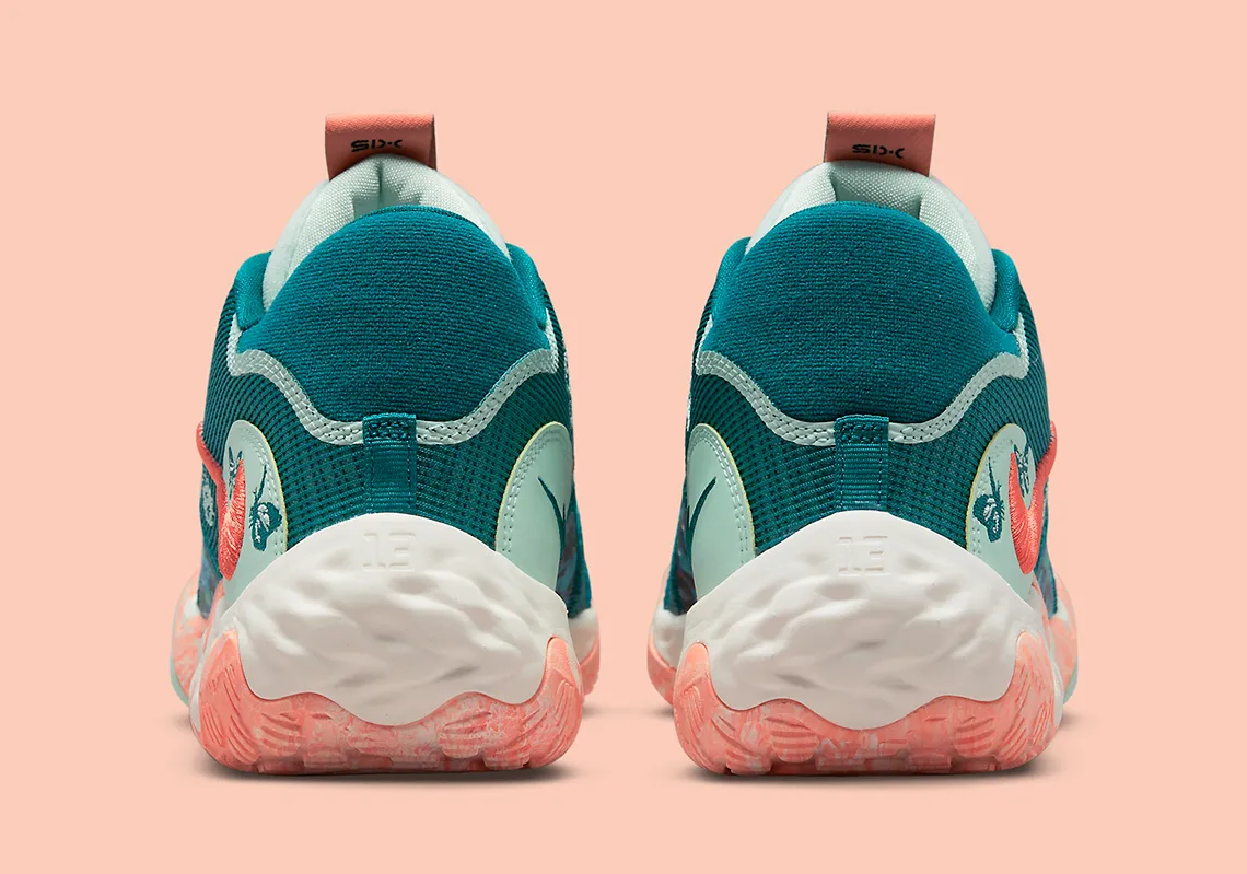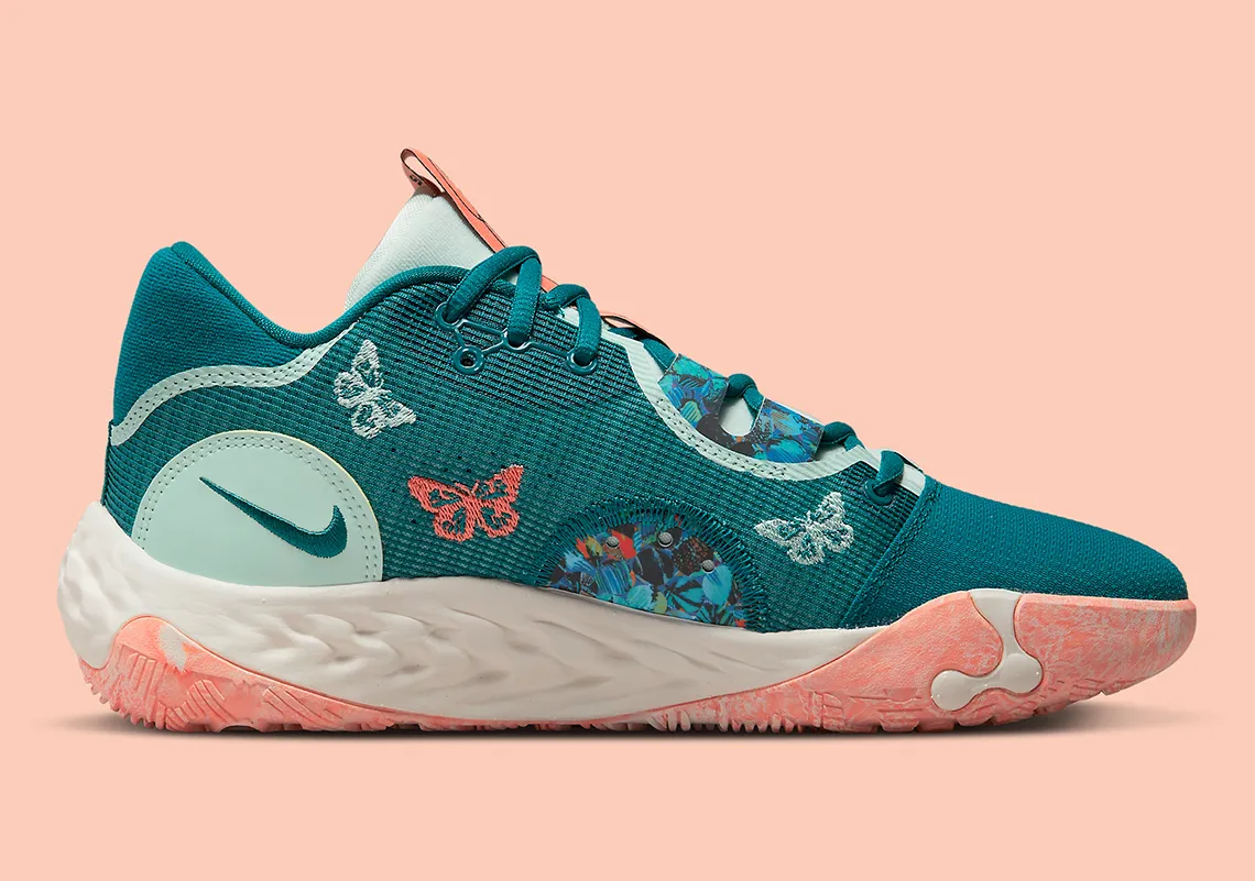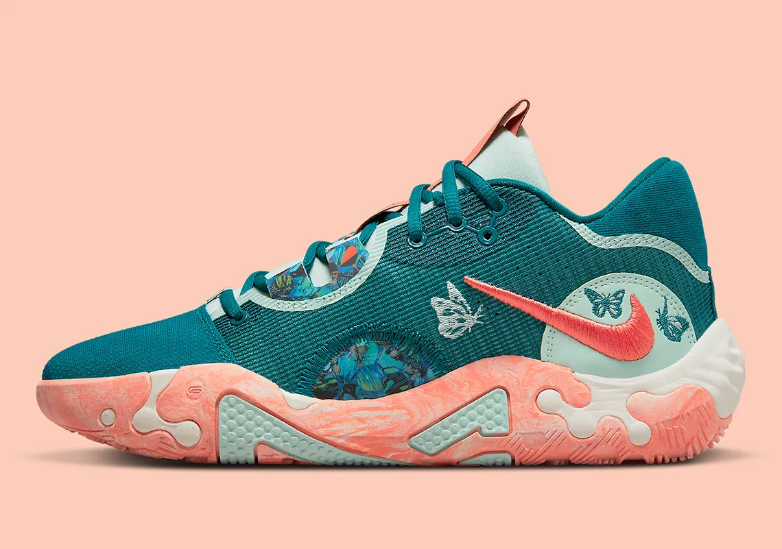 Nike a choisi de mettre ses nouveaux modèles à l'honneur pour la Saint-Valentin puisqu'avec la Kyrie 8 et la Zoom Freak 3, la PG 6 a été mise à l'honneur avec ce coloris original, habillée de deux teintes de vert sur la tige et d'une association beige-rose saumon sur la semelle.