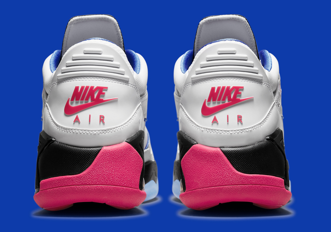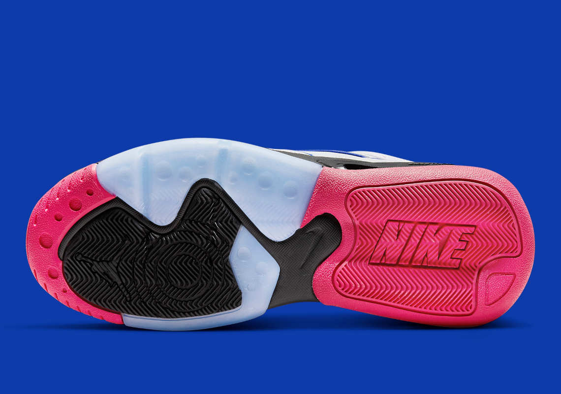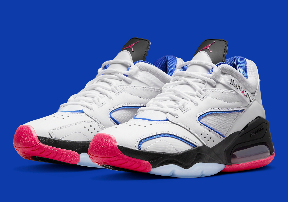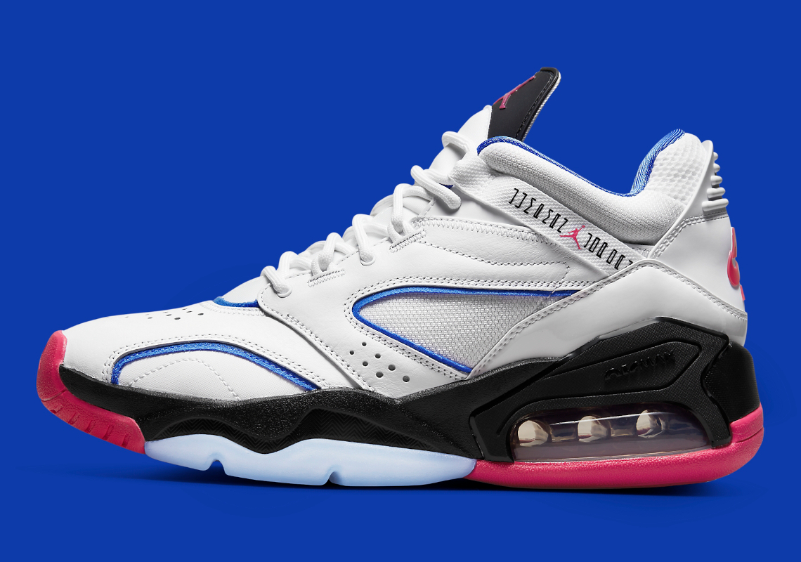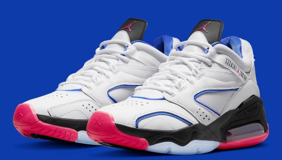 La semelle intermédiaire ressort en noir, tout comme le haut de la languette, sur laquelle apparaît le « Jumpman » en « Fireberry », ce rose un poil foncé qui recouvre également la semelle extérieure en majeure partie et fait ressortir l’inscription « Nike Air » sur le talon.