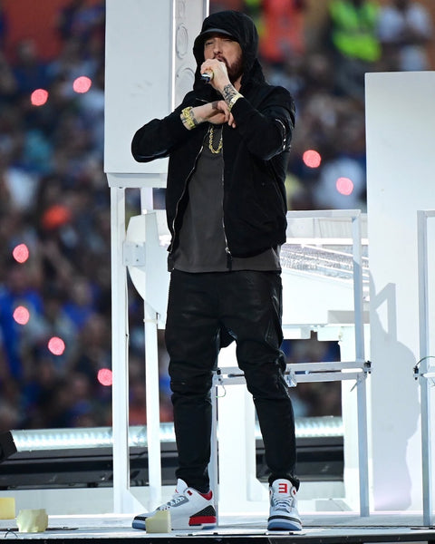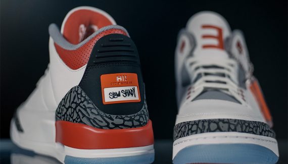 Aucune info sur une éventuelle commercialisation n’a encore filtré, mais « Jordan Brand » pourrait bien céder sous la pression au regard de l’enthousiasme régnant autour de ces Air Jordan 3 PE (pour « Player Exclusive) portées par Eminem lors du show de la mi-temps du dernier Superbowl. Les Sneakers de “Slim Shady” ont en effet fait partie des stars qui ont pris part à ce mini concert hors du commun.