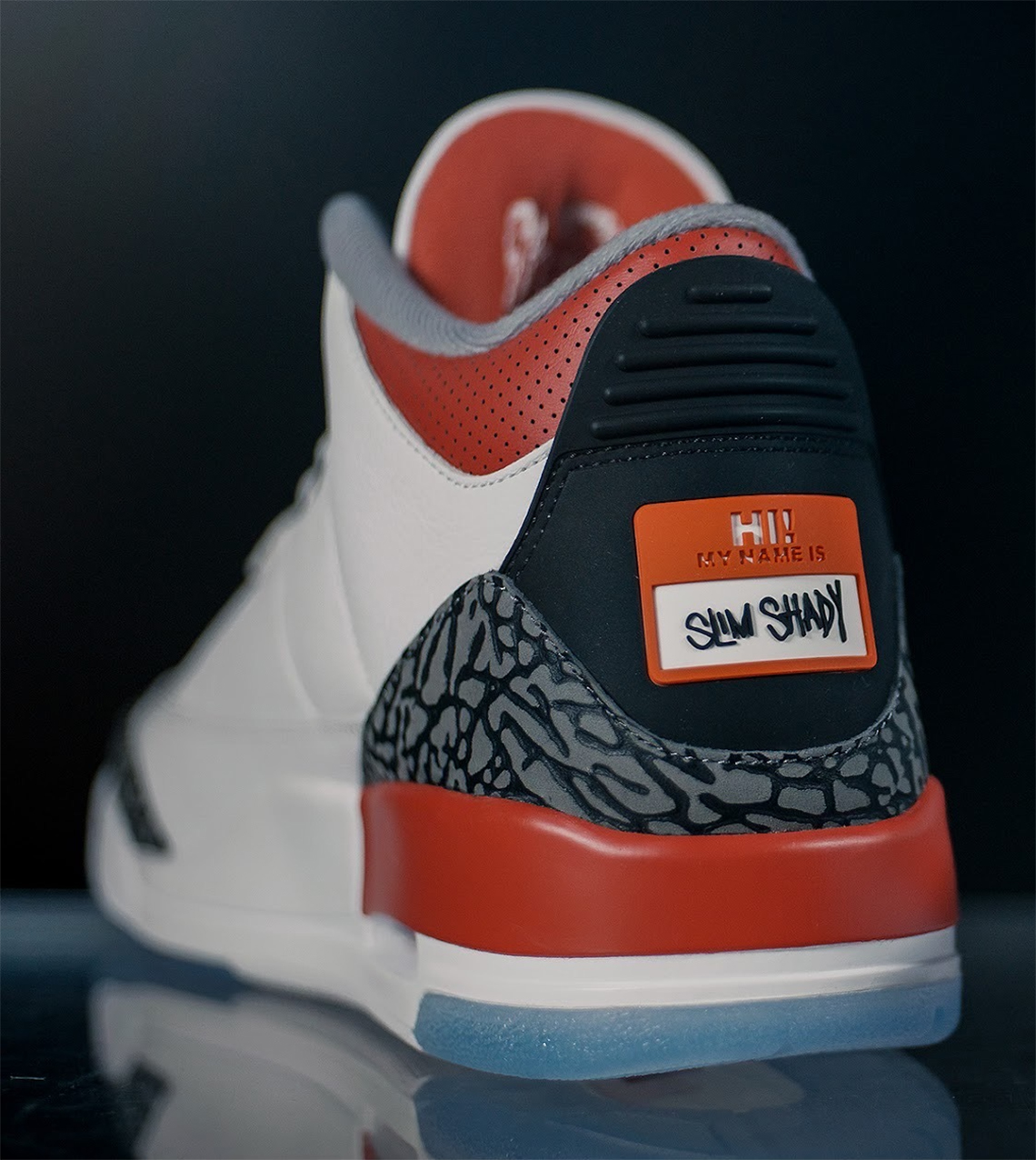 Au niveau de la composition, on retrouve une tige majoritairement blanche, contrastée par des touches de noir et de rouge, l’ensemble reposant sur une semelle extérieure translucide. Les personnalisations sont bien visibles sur le « Hi ! My name is » accompagné du « Slim Shady » sur le talon, ainsi que le « E » à l’envers sur la languette.