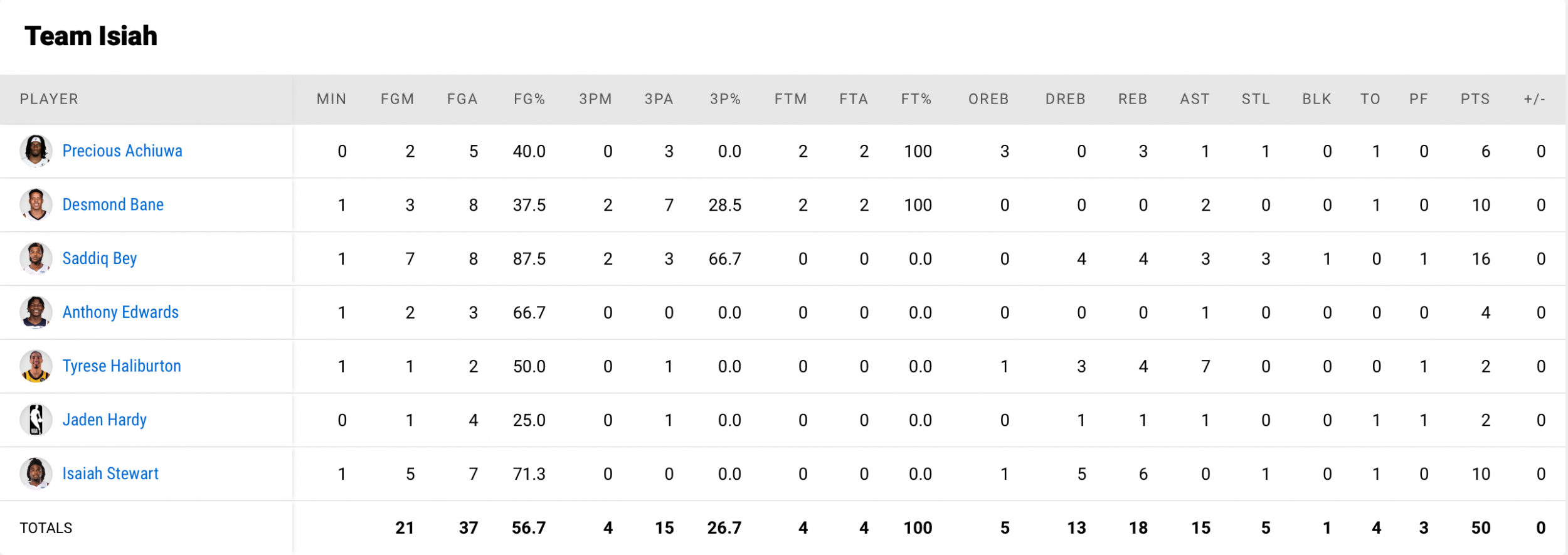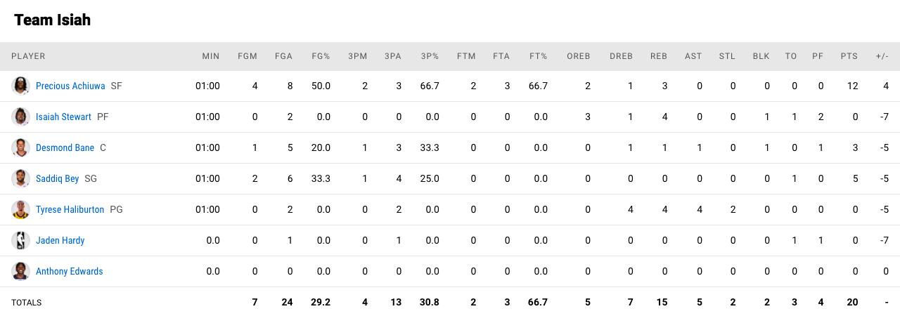 — Team Isiah Thomas : Tyrese Haliburton, Jaden Hardy, Anthony Edwards, Desmond Bane, Saddiq Bey, Precious Achiuwa, Isaiah Stewart.