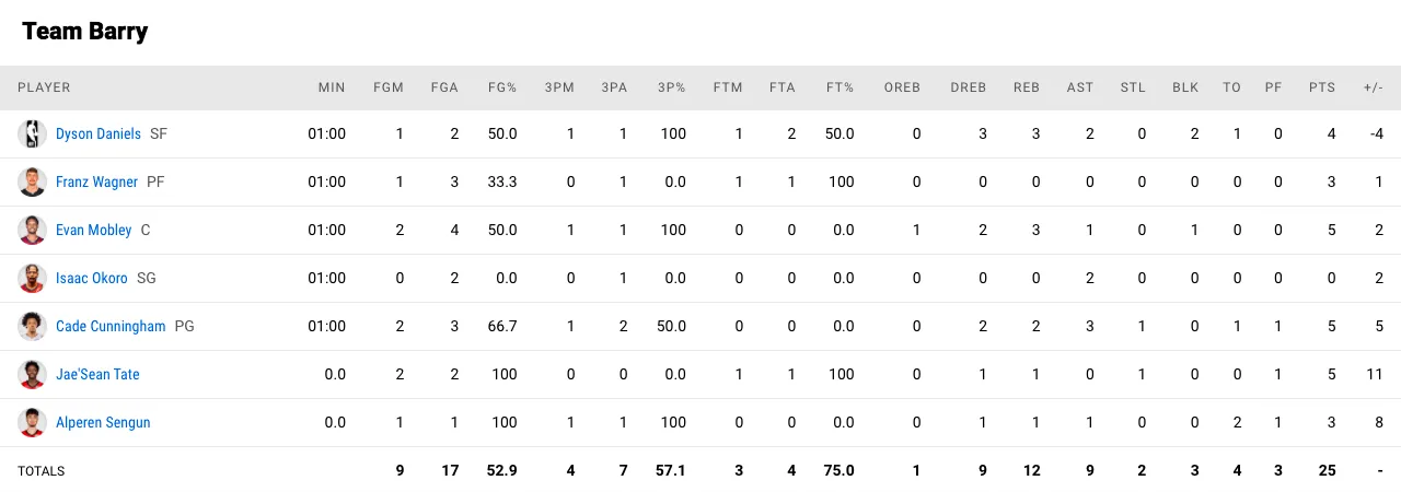 — Team Rick Barry : Cade Cunningham, Dyson Daniels, Isaac Okoro, Franz Wagner, Jae'Sean Tate, Evan Mobley, Alperen Sengun.