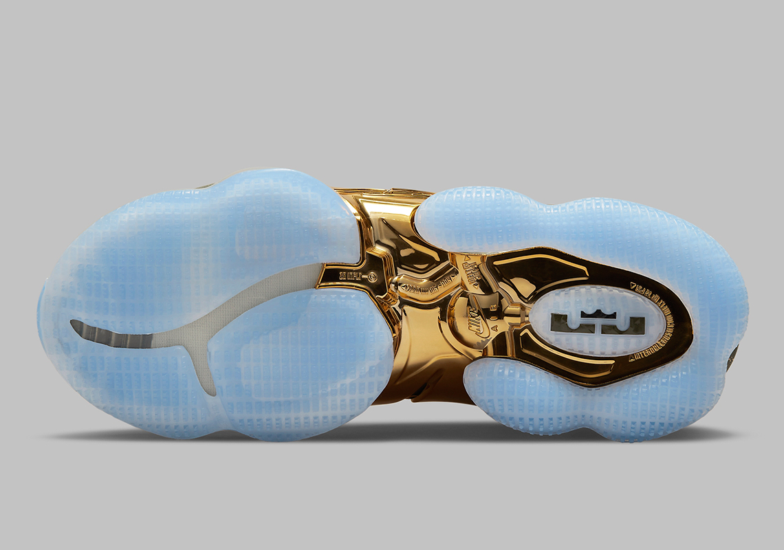 La tige en noire et blanc est rehaussée par des bandes centrales en doré. La semelle intermédiaire est également noire, tachetée d’or, reposant sur une semelle extérieure translucide. L’inscription « Chosen 1 » apparaît sur la languette.