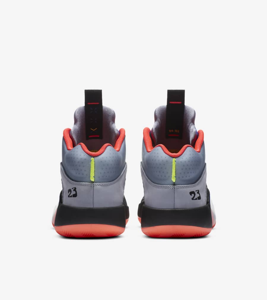 Le contraste de la tige grise et noire apparaît via les touches d’orange vif au niveau de la semelle extérieure et sur les contours du col. La languette bleue est assortie d’un « Jumpman » rouge.