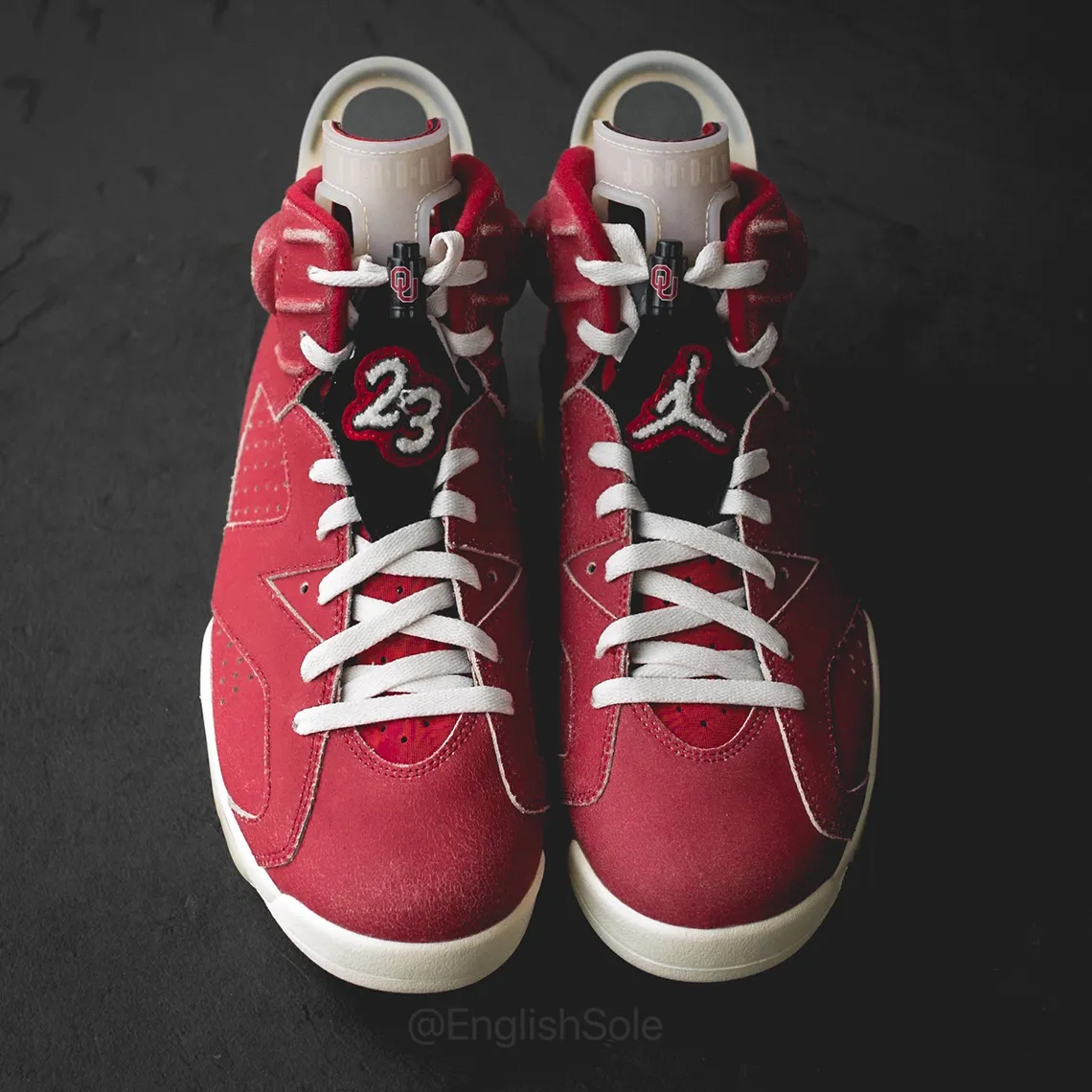 Après Georgetown, Florida ou encore Michigan, c'est au tour de l'université d'Oklahoma et son équipe de basket des Sooners d'être mis à l'honneur par Jordan Brand. La marque au « Jumpman » va en effet sortir une Air Jordan 6 aux couleurs de l'ancienne équipe de Blake Griffin ou plus récemment Trae Young.