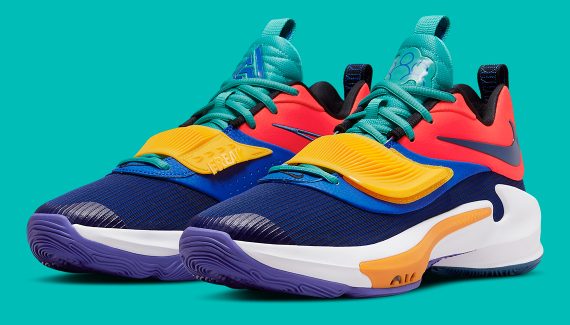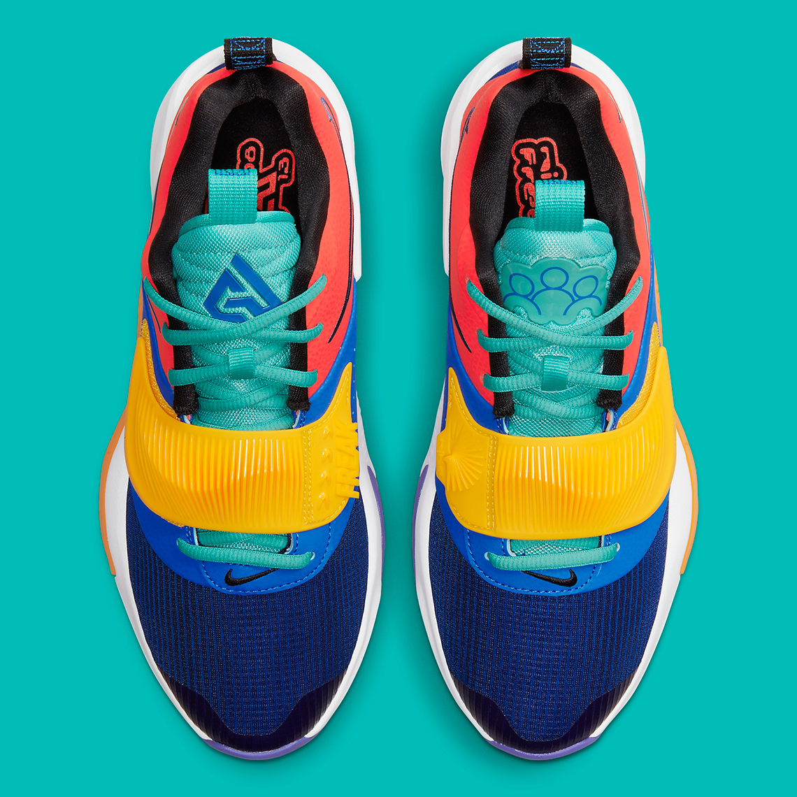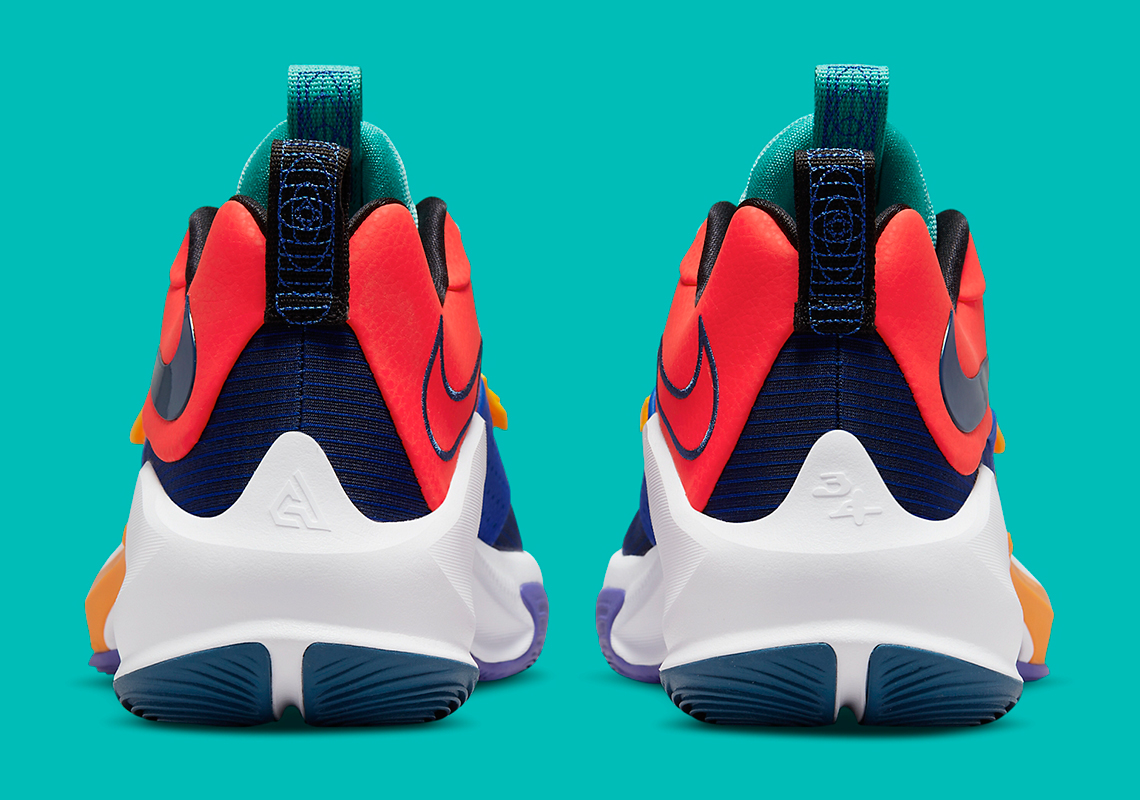 Pour cette version « AntetokounBros », la paire a été habillée sur un thème multicolore. La tige associe en effet deux teintes de bleu, du jaune, du rouge ainsi que du bleu-vert sur la languette. C’est d’ailleurs sur la languette de la chaussure gauche que l’on aperçoit trois silhouettes symbolisant ses trois frères. L’ensemble repose sur une semelle extérieure en violet et bleu-marine.