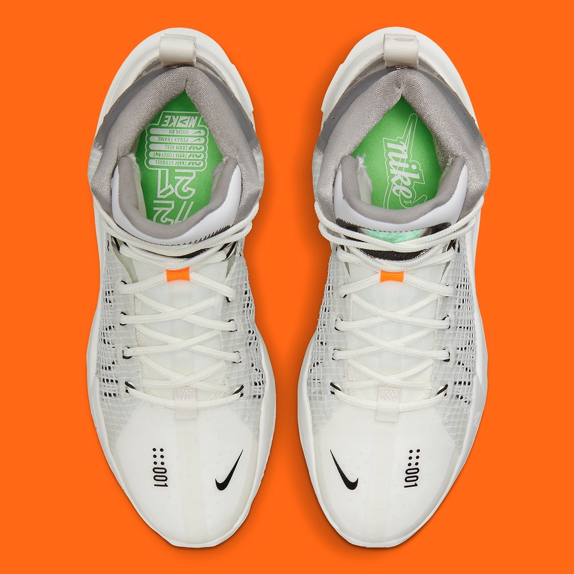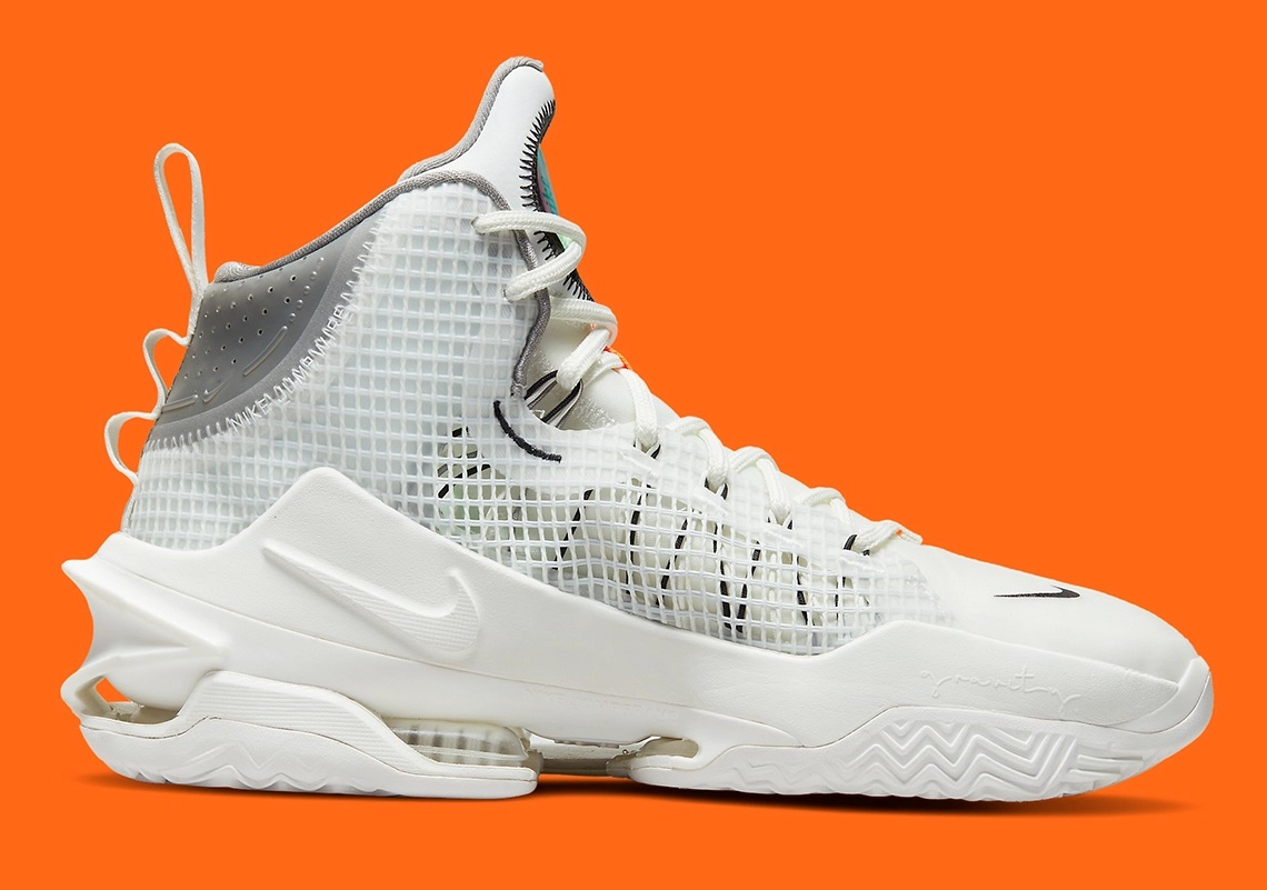 Après avoir dévoilé un coloris « spatial », la Nike Zoom GT Jump reste dans le futur avec cette nouvelle version digne de chaussures de spationaute. Classique à première vue avec une tige principalement blanche avec des finitions noires et argentées, ce coloris regorge de petites touches qui viennent magnifier l’ensemble.
