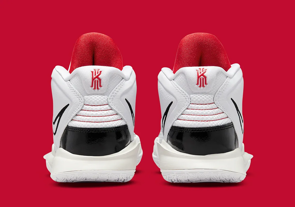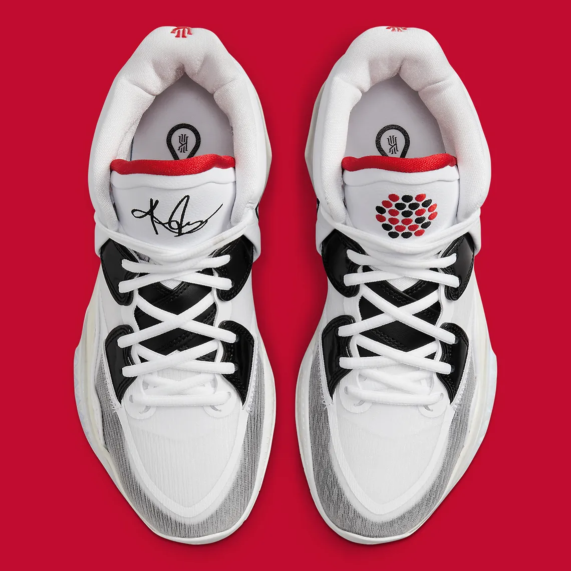 La tige en mesh et en cuir grainé blanc est assortie d'une bande en gris chiné à l'avant. Les attaches principales des lacets en noir brillant ainsi que les touches de rouge présentes à l'intérieur de la languette et sur le logo de Kyrie Irving au niveau du talon complètent l'ensemble.
