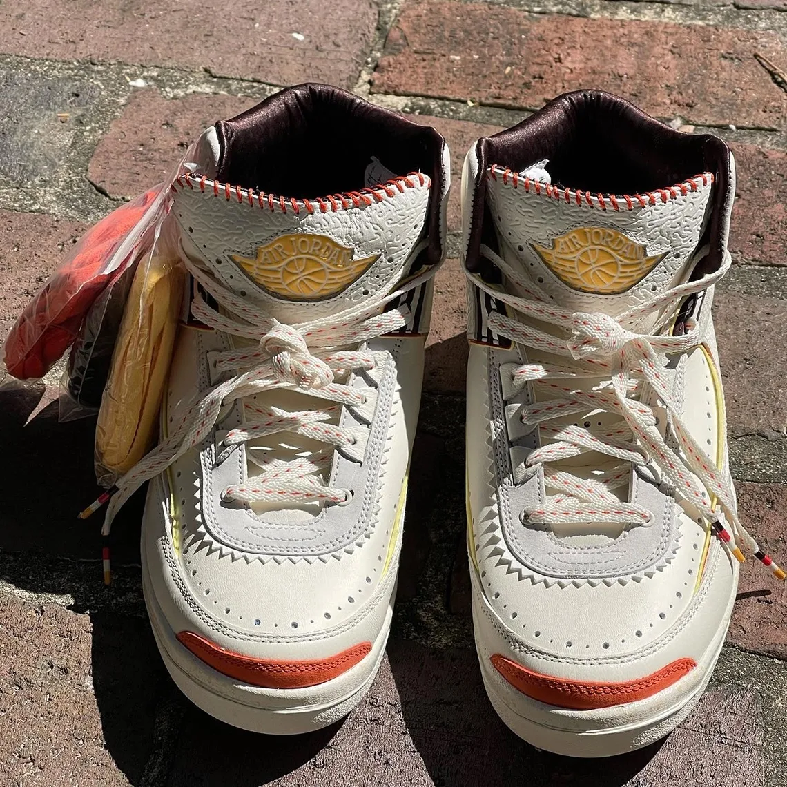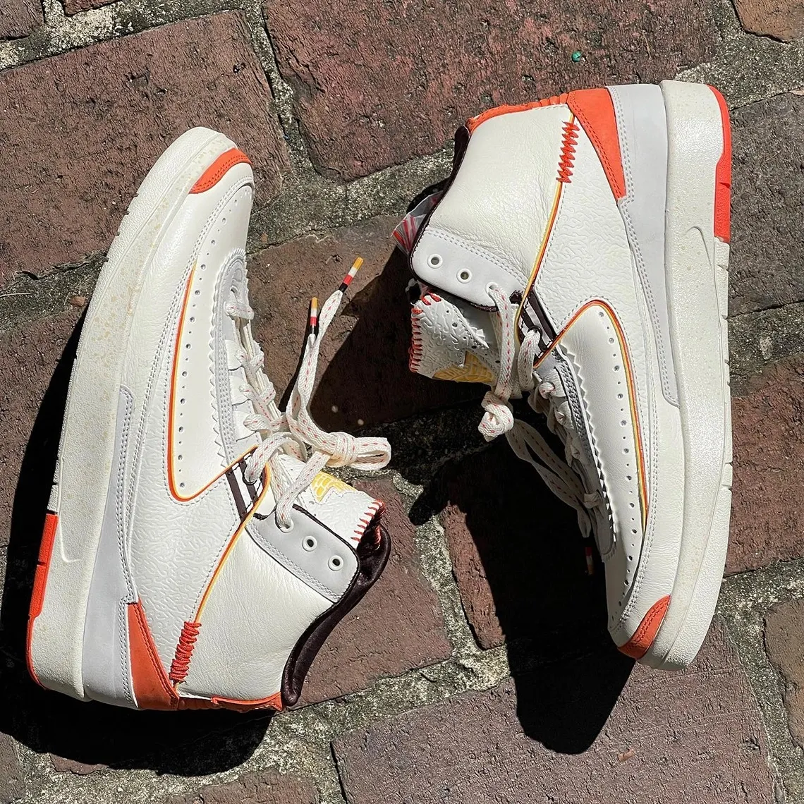 Après une première “Air Jordan 1” conçue en 2019, la « Air Jordan 2 » revisitée ici présente une tige blanche assortie de subtiles finitions et réhaussée par des finitions en jaune-orangé, comme les bandes en orange situées à l’avant de la paire et au niveau du talon, et le logo Air Jordan en jaune sur la languette ainsi que les inscriptions « Nike » et « Maison Château Rouge » également présentes sur le talon.
