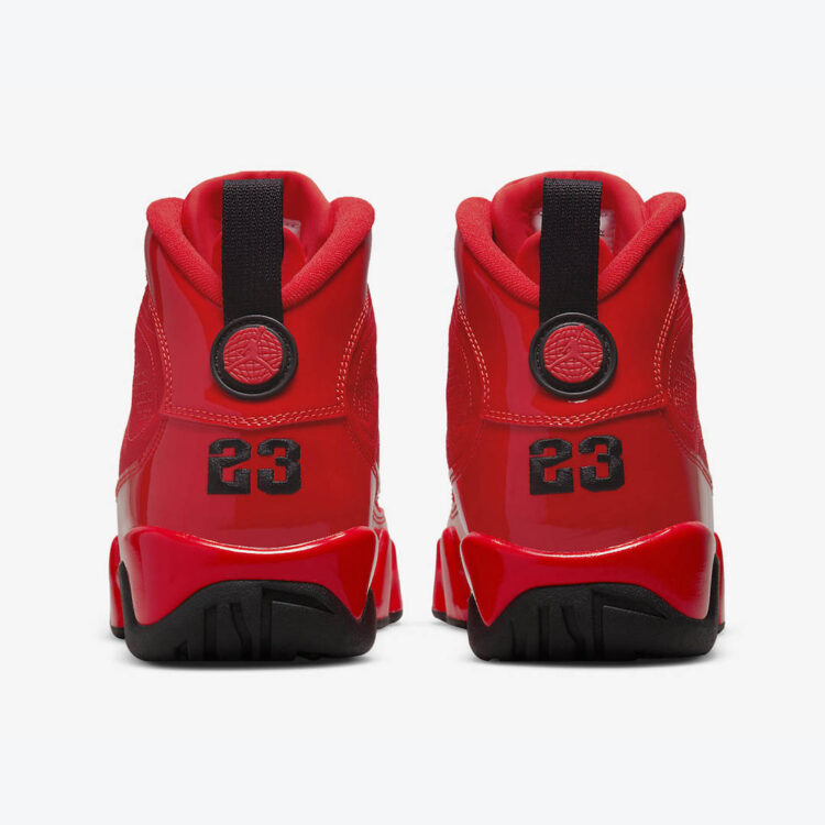 L’occasion de revoir les clichés officiels de ce modèle « rouge piment » à couper le souffle, avec un rouge vif pour recouvrir les parties en cuir verni et la semelle intermédiaire pour compléter les parties en mesh sur la tige. Seuls les œillets, la semelle extérieure, la tirette et le talon ressortent en noir, avec le numéro 23 bien visible sur le talon.