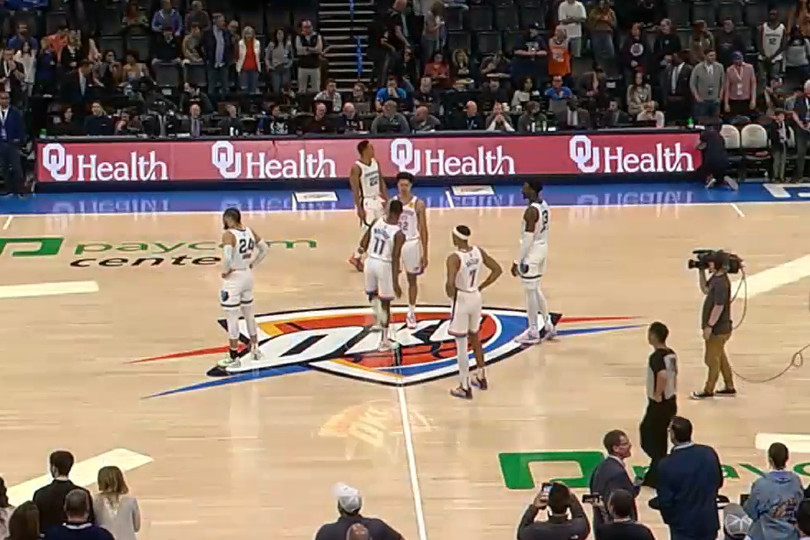 Pendant que les Grizzlies se changeaient, Rumble le Bison a occupé le public d’un festival de briques (normal, à Bricktown), dos au panier du milieu du terrain, tandis que le speaker du Thunder annonçait une session supplémentaire d’échauffement de cinq minutes. Une session finalement annulée, en accord avec les deux capitaines.