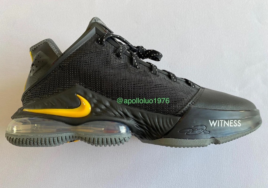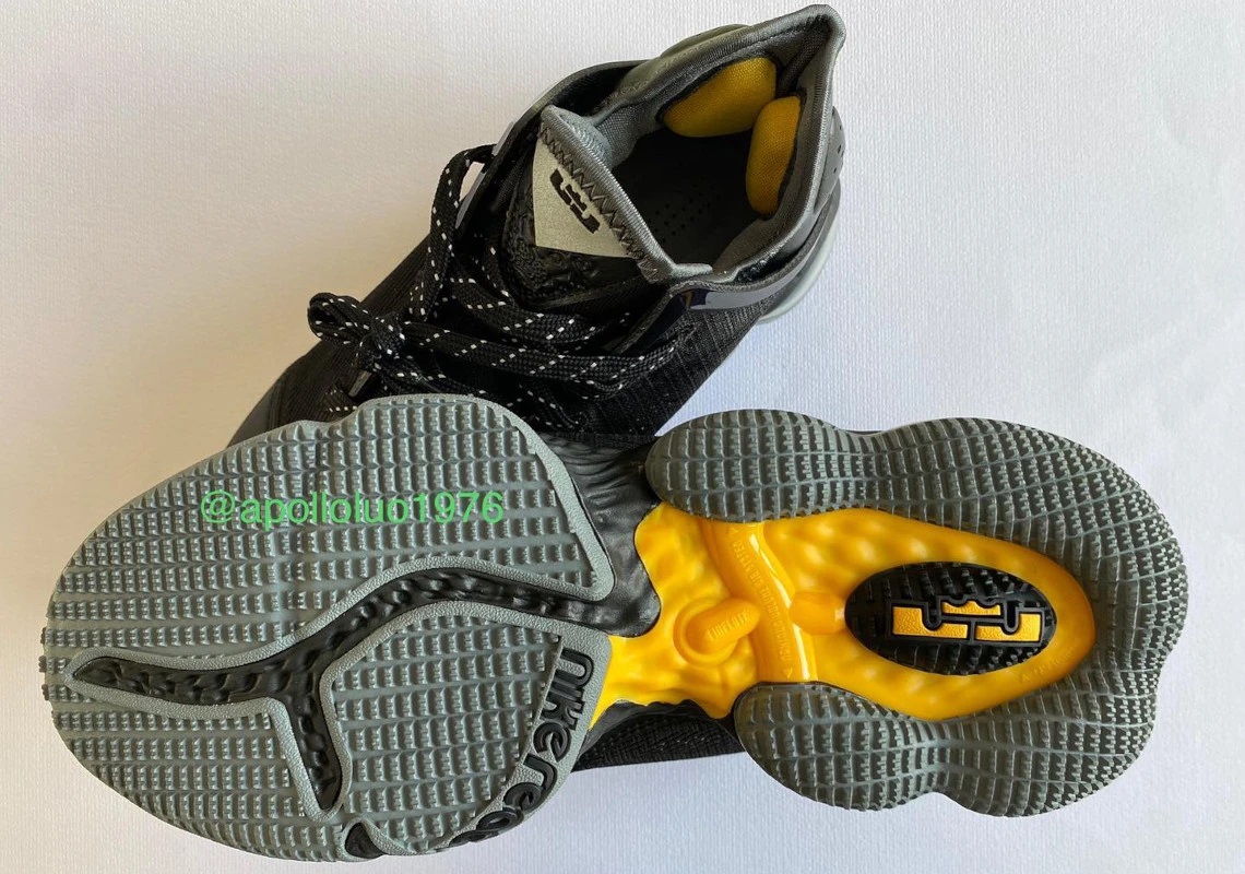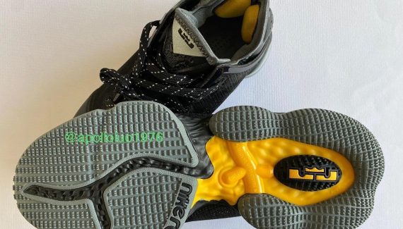 L’association entre le noir, majoritaire, et quelques touches de jaune est plutôt familière chez les LeBron à l’approche des playoffs. On retrouve donc une tige principalement noire, marquée d’une virgule jaune à l’avant du pied et d’une partie arrière en gris, l’ensemble reposant sur une semelle également noire et grise.