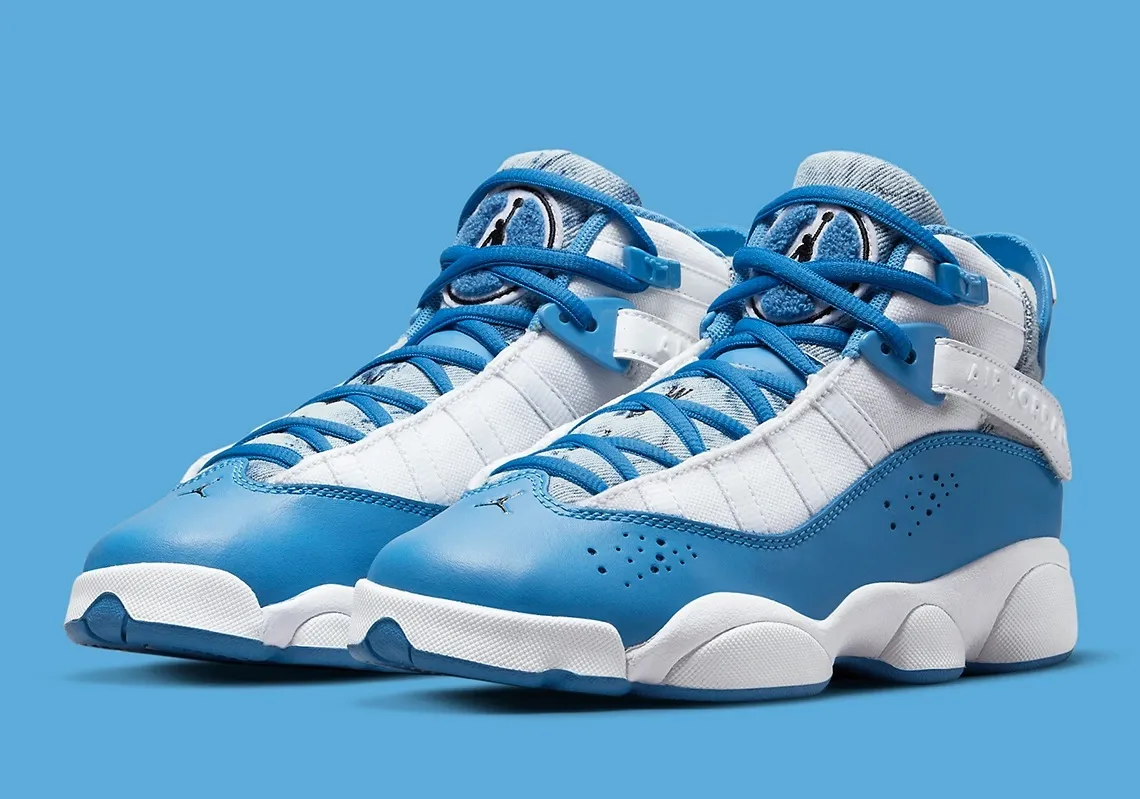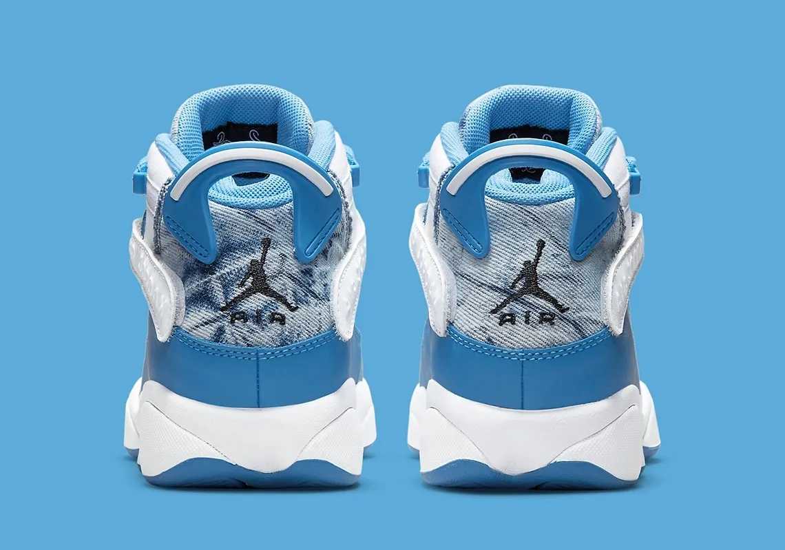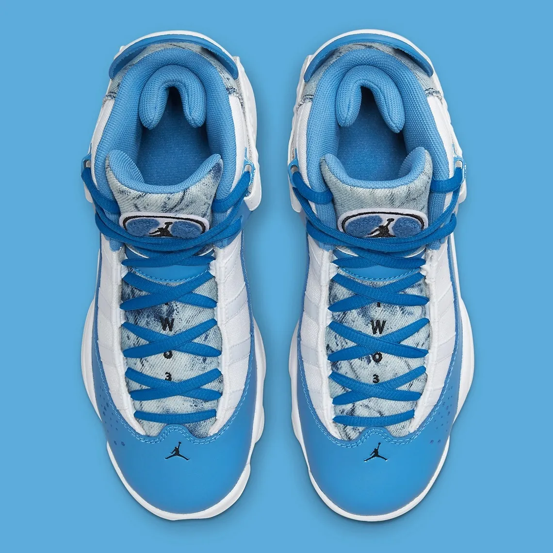 Cette nouvelle version de la 6 Rings est plutôt originale puisque qu’elle comporte des touches de « Denim » sur la languette et une partie du talon. La tige allie quant à elle une base aux couleurs de North Carolina, l’université de Michael Jordan, et une partie blanche en toile. Les lacets et la base de la tirette sont également couleur « UNC ».
