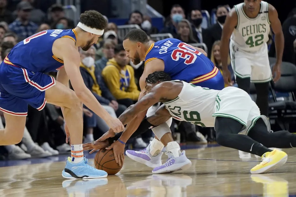 Il emmène avec lui la jambe gauche de Stephen Curry. Bien qu’il ait transmis le ballon à Jayson Tatum, ce dernier le perd et les Warriors jouent la contre-attaque. Marcus Smart revient en défense et tente de gêner Klay Thompson, avec un geste peu académique et un pied très haut, au niveau des épaules de l’arrière de Golden State.