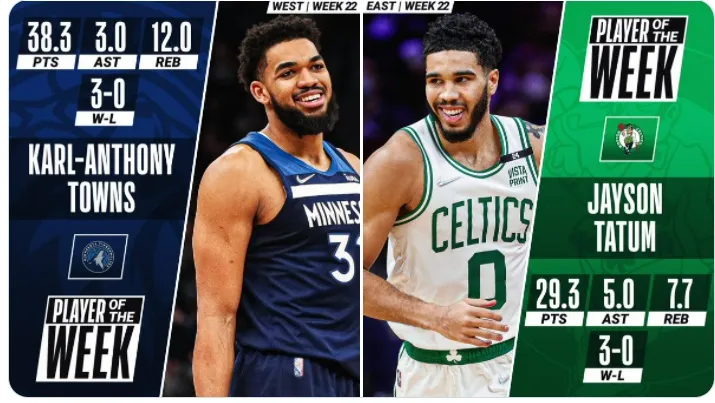 Cette semaine, Jayson Tatum a tourné à 29.3 points, 7.7 rebonds et 5 passes de moyenne, quand Boston gagnait ses trois matches. Même bilan pour les Wolves de Karl-Anthony Towns, qui compile 38.3 points et 12 rebonds par match.