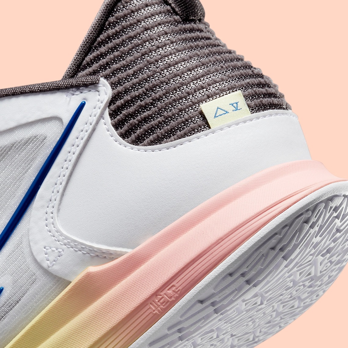 Premier coloris prévu pour le mois d’avril : ce mix éclatant avec une tige blanche marquée de teintes de jaune et dont les contours du « swoosh » ressortent en bleu marine. Le haut du talon et l’intérieur du col apparaissent en noir tandis que la semelle intermédiaire reprend un dégradé de couleurs allant du rose au jaune, avec une unité Air Zoom en bleu marine, l’ensemble reposant sur une semelle extérieure blanche.