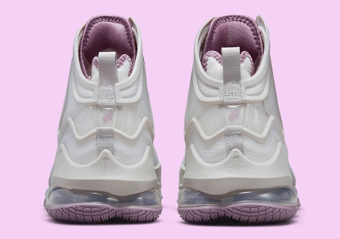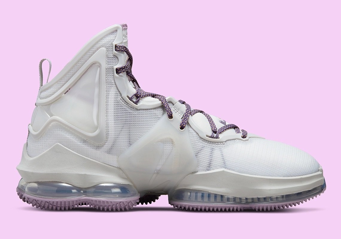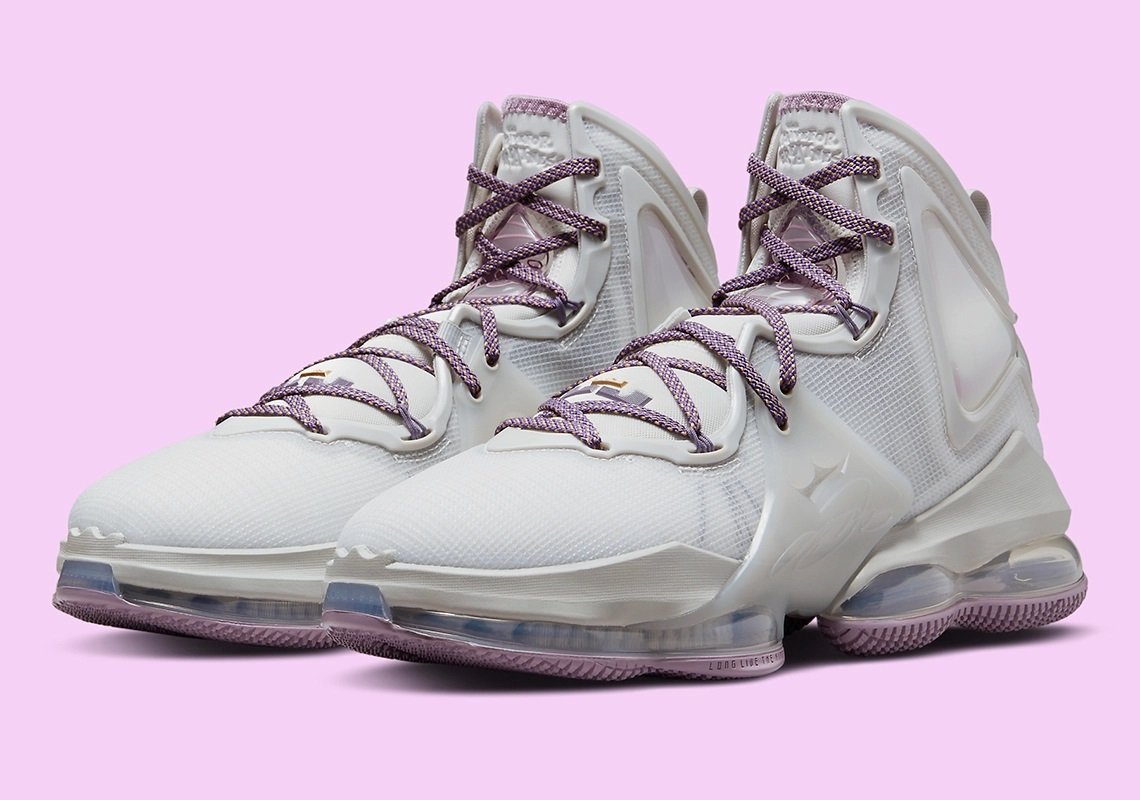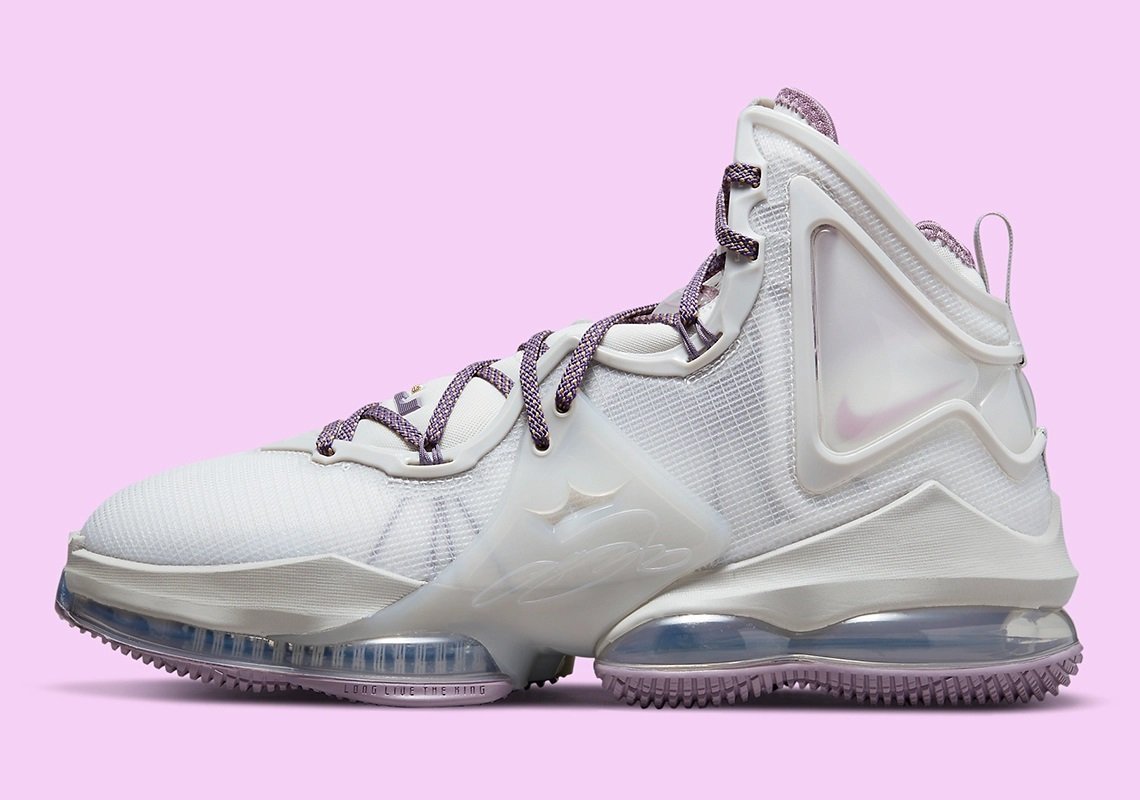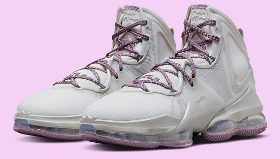 La tige est essentiellement habillée d’un blanc nacré, contrastée par des touches de mauve sur les lacets, l’intérieur du col et la semelle extérieure. L’inscription « Strive For Greatness » apparaît sur la languette.