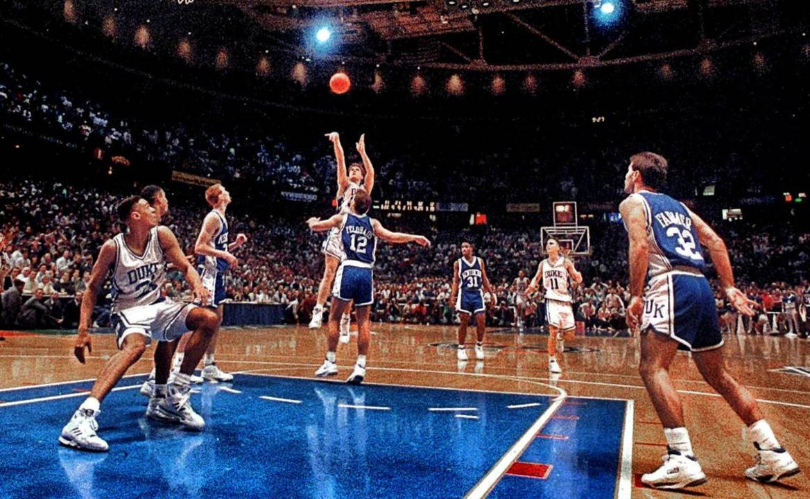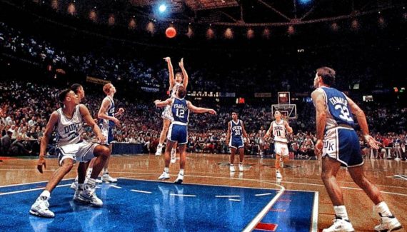 Il faut dire que tout est réuni dans ce shoot. C’est la finale régionale de la “March Madness” entre les Blue Devils de Mike Krzyzewski, champions en titre, et les Wildcats de Rick Pitino. Christian Laettner réussit le match parfait (31 points à 10/10 au tir et 10/10 aux lancers-francs) mais les deux équipes doivent se départager en prolongation. Aux côtés de Jamal Mashburn (28 points, 10 rebonds), Sean Woods (21 points, 9 passes) pense donner la victoire à Kentucky par-dessus l’intérieur adverse, avec la planche…