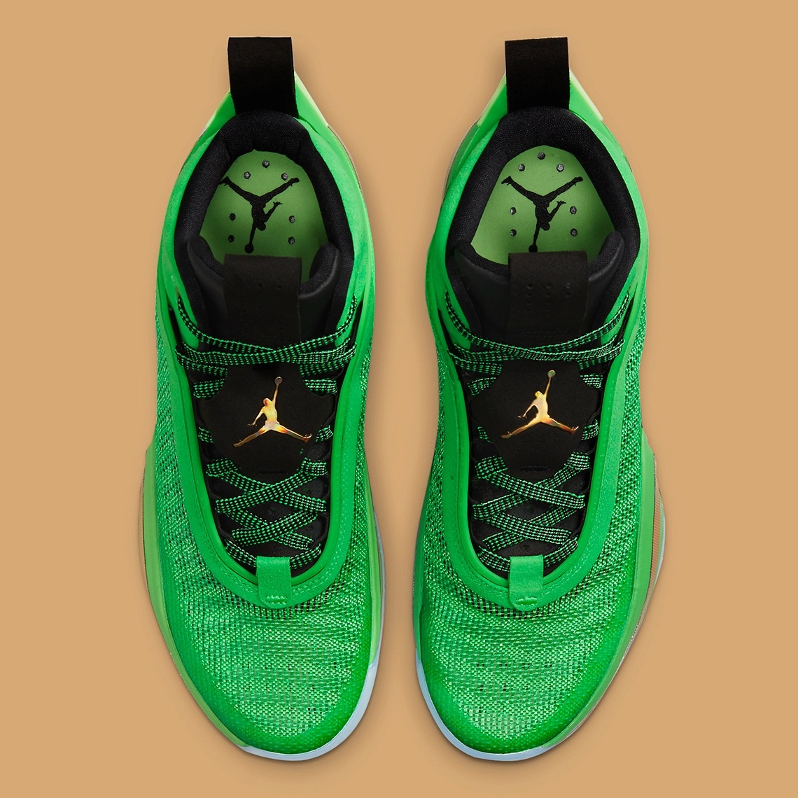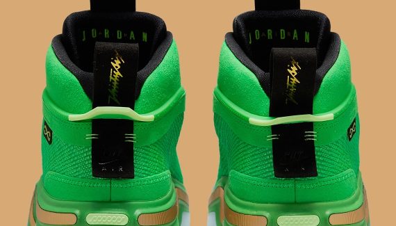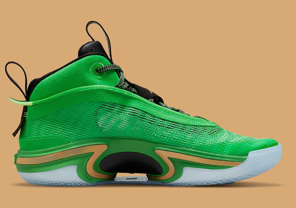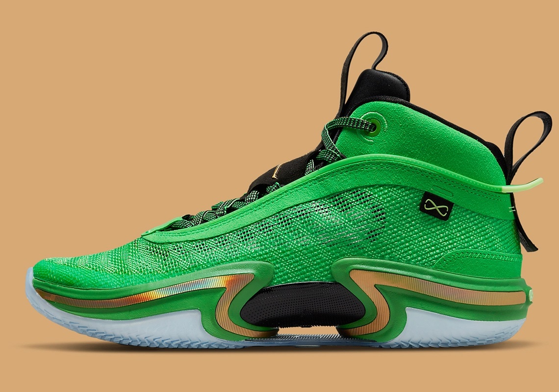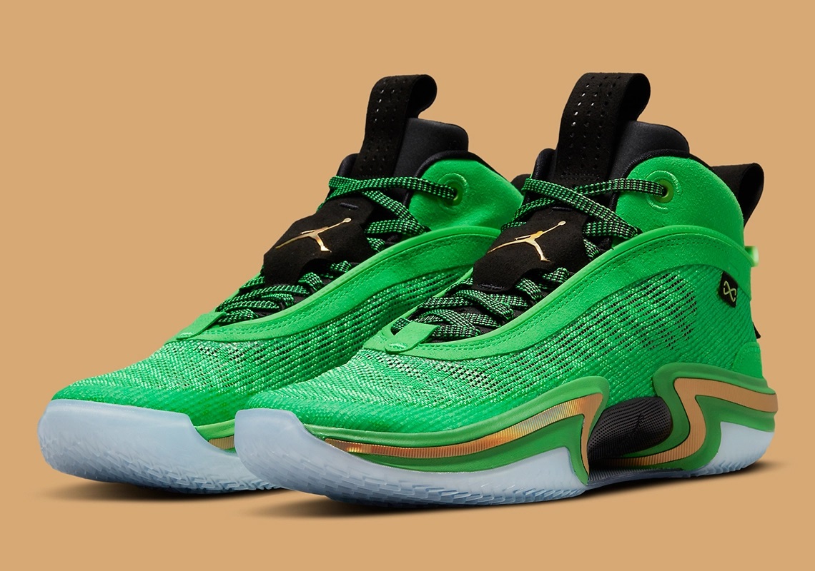 Jayson Tatum a fait partie des premiers joueurs à porter le petit bijou qu’est la Air Jordan 36 avec le coloris « First Light ». La star des Celtics pourra bientôt disposer d’un modèle plus raccord avec le maillot de Boston, « Jordan Brand » ayant dévoilé un nouveau coloris alliant du vert clair sur la tige en Leno à une languette et un col noir sur lesquels le « Jumpman » et l’inscription « Thirtysix » ressortent en doré.