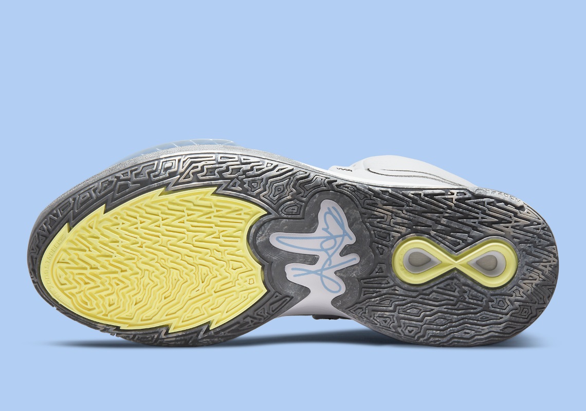 Du côté de Nike, on prépare ce retour au jeu « à temps plein » par la sortie de nouveaux coloris dont cette nouvelle version de la Kyrie 8 baptisée « Smoke and mirrors », alliant des parties bleu ciel en mesh et en cuir pour accompagner la tige, majoritairement blanche.
