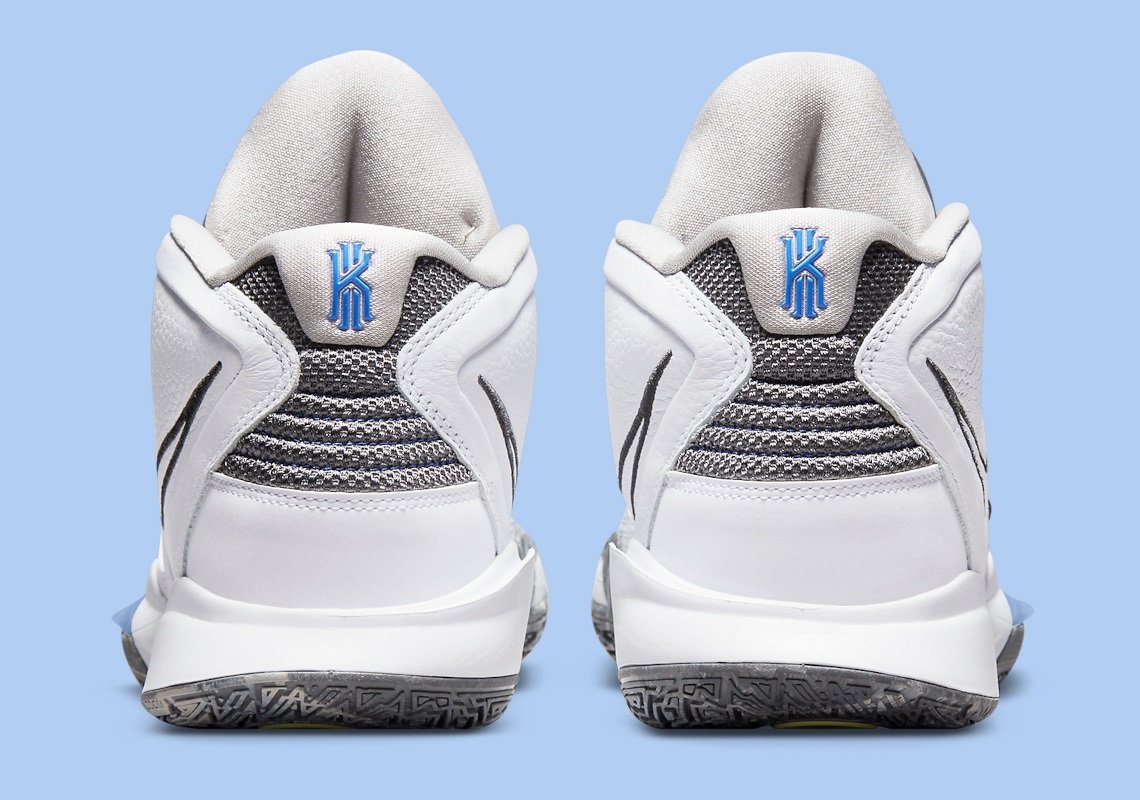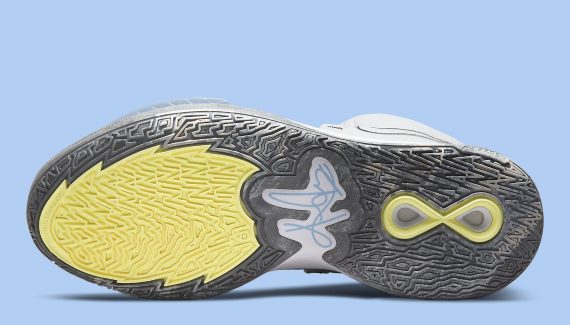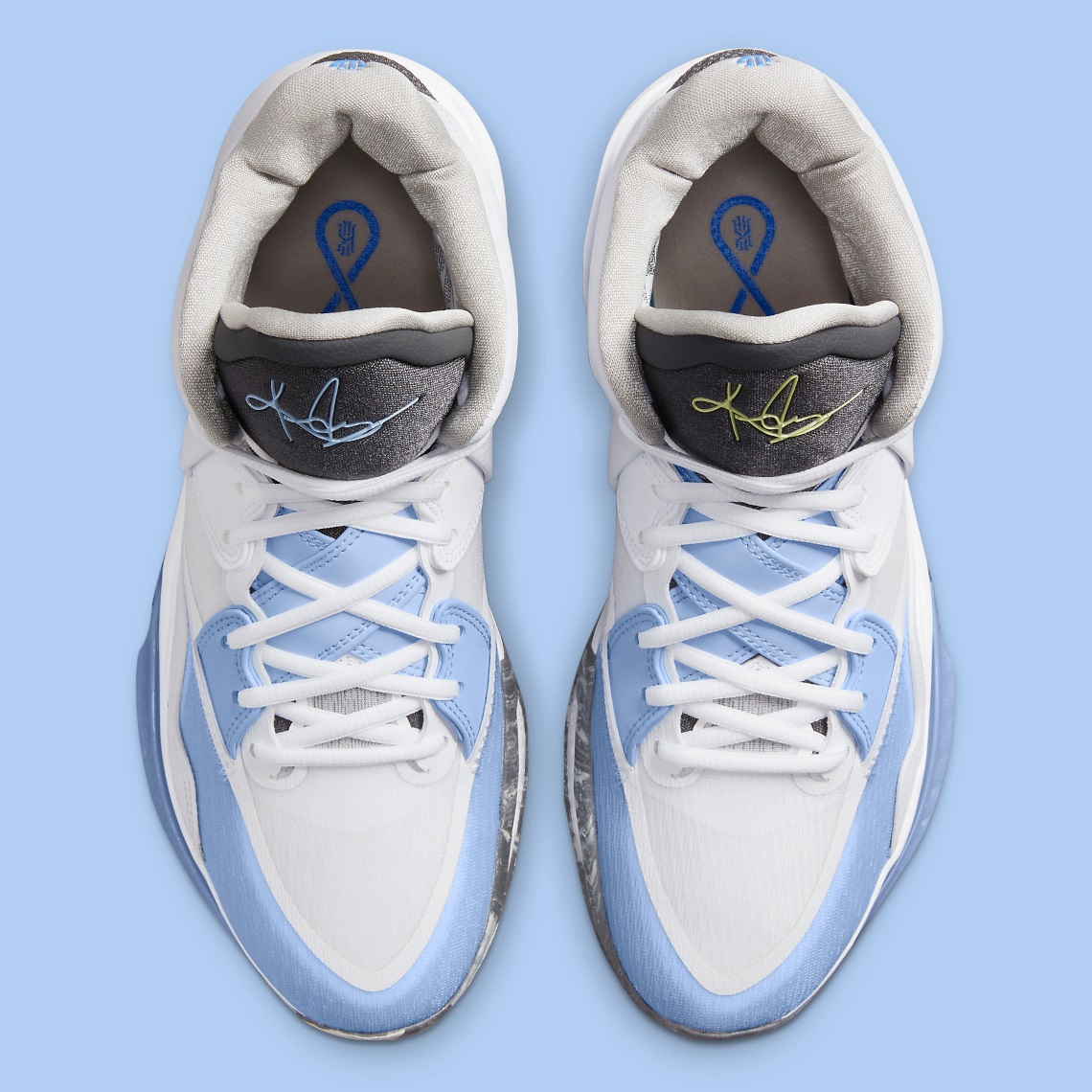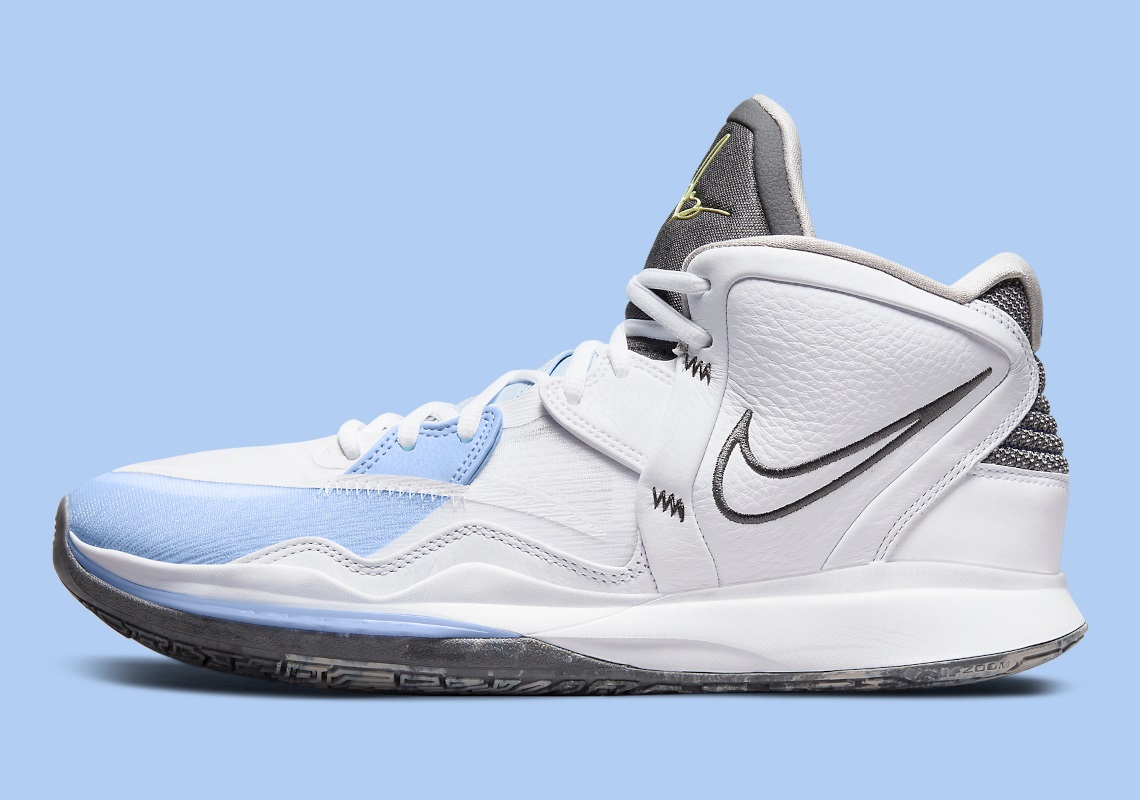 Du côté de Nike, on prépare ce retour au jeu « à temps plein » par la sortie de nouveaux coloris dont cette nouvelle version de la Kyrie 8 baptisée « Smoke and mirrors », alliant des parties bleu ciel en mesh et en cuir pour accompagner la tige, majoritairement blanche.
