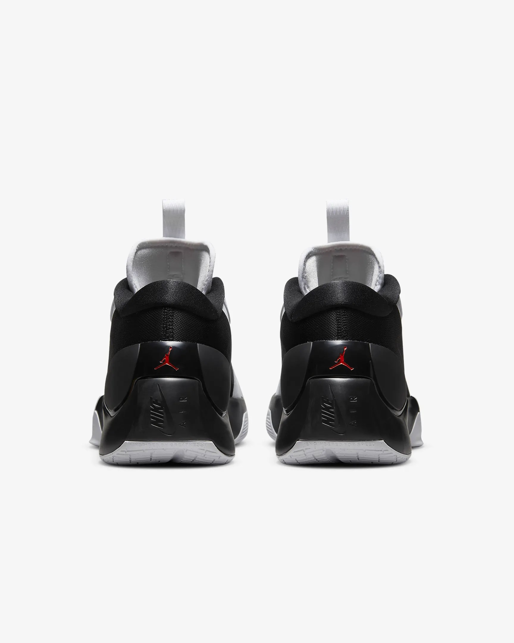 La tige est habillée en blanc à l’avant et en noir à l’arrière, l’ensemble étant ponctué de touches de rouge comme sur le « Jumpman » placé sur le talon sur fond noir, ou sur fond blanc sur la languette.