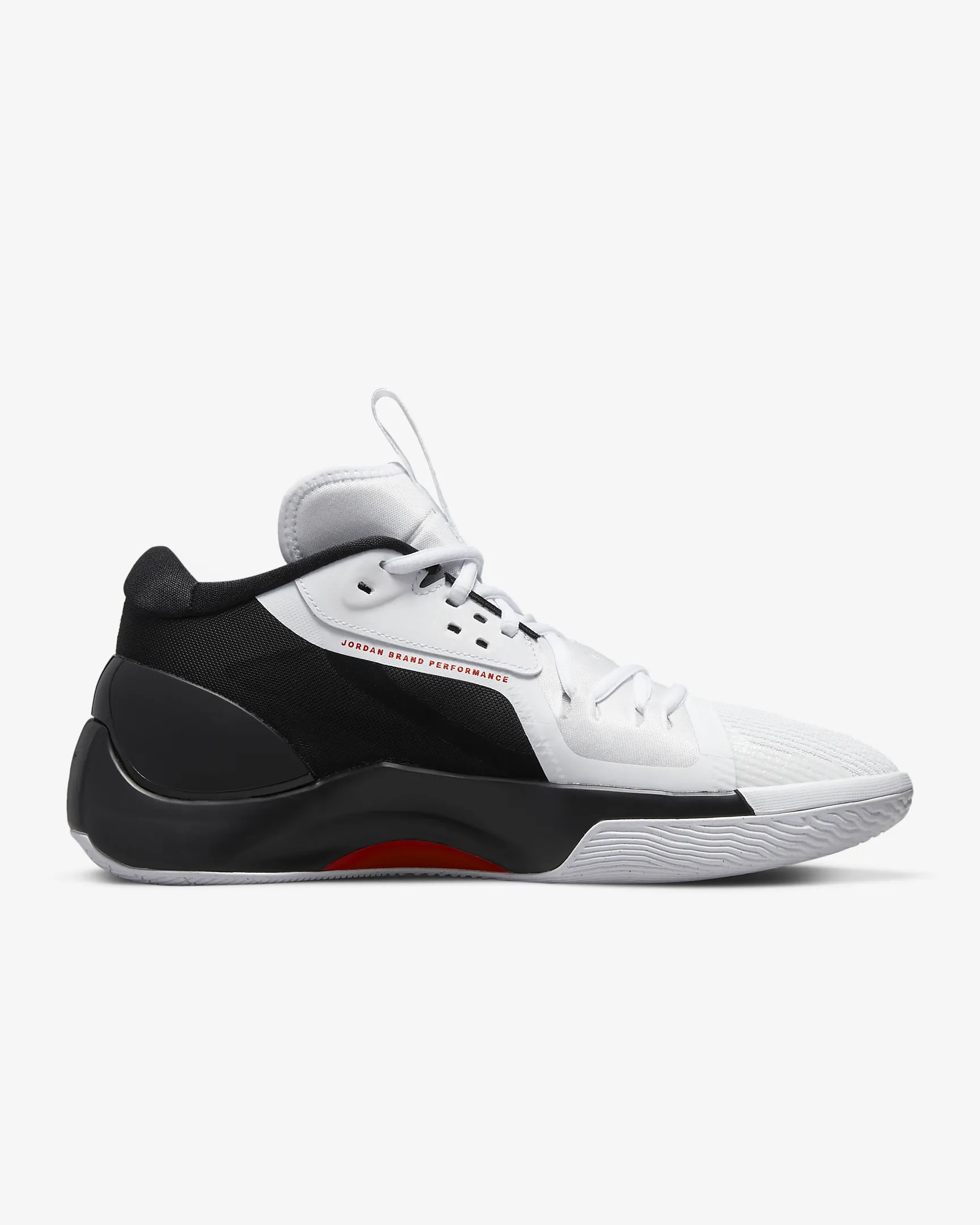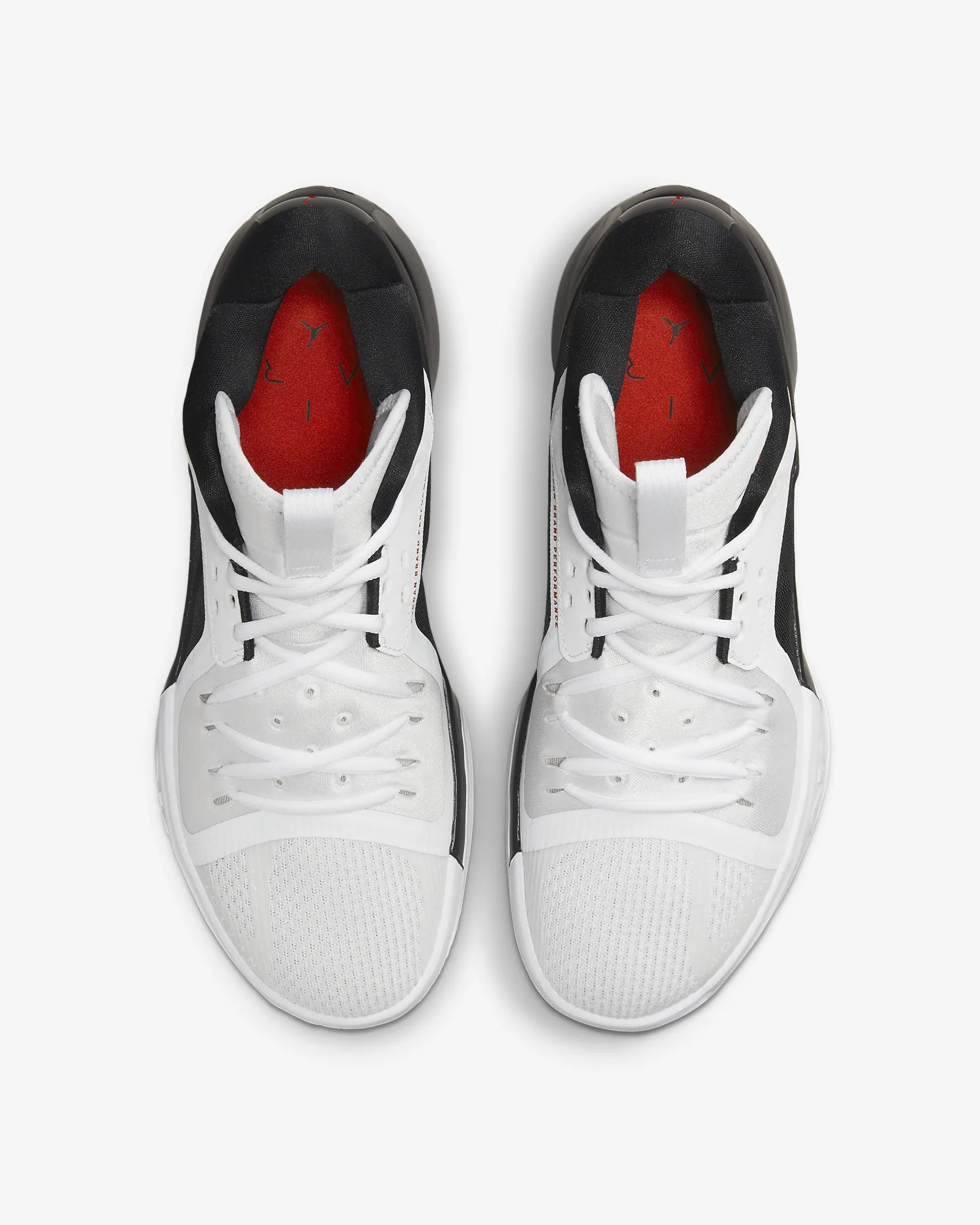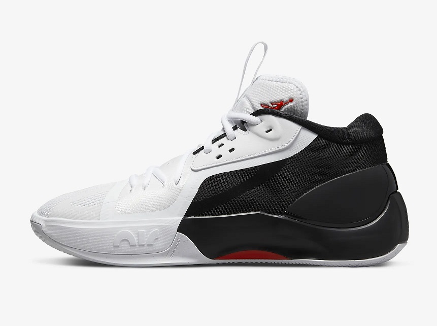 La tige est habillée en blanc à l’avant et en noir à l’arrière, l’ensemble étant ponctué de touches de rouge comme sur le « Jumpman » placé sur le talon sur fond noir, ou sur fond blanc sur la languette.