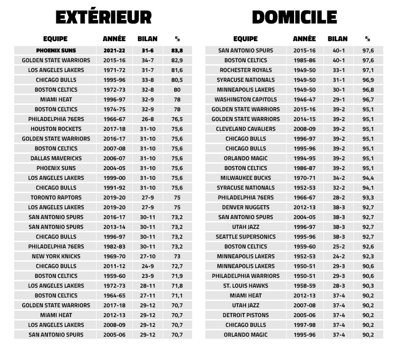 En effet, avec 31 victoires sur 37 matchs disputés loin de leur Footprint Center, les Suns peuvent encore battre les Warriors de 2015/16, qui avaient gagné 34 de leurs 41 matchs à l’extérieur. Pour égaler ce record, il faut donc que Phoenix gagne au moins trois de ses quatre derniers matchs, et donc les quatre pour le battre. Le calendrier de ces matchs ? Memphis ce soir, Oklahoma City dimanche, les Clippers jeudi prochain et le Jazz vendredi.