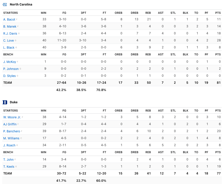 C’est logiquement Caleb Love qui va tuer le match sur un 3-points, en profitant du changement face à Mark Williams ! Le jeu des lancers-francs ne permettra pas à Duke de réaliser le hold-up et, comme lors du dernier match à domicile de Coach K, les joueurs d’Hubert Davis gâchent la fête pour Duke et son légendaire entraîneur.