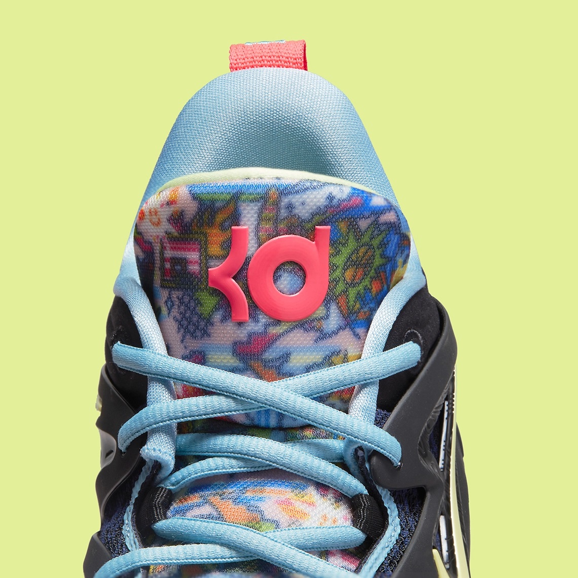 La languette, sur laquelle figure le logo « KD » contraste également avec des motifs originaux, tandis que les lacets ressortent ici en bleu clair, tout comme le col intérieur. A noter également la présence de l'inscription « Easy » et du numéro « 07 », correspondant à celui de son maillot, respectivement sur la tirette et en bas du talon.