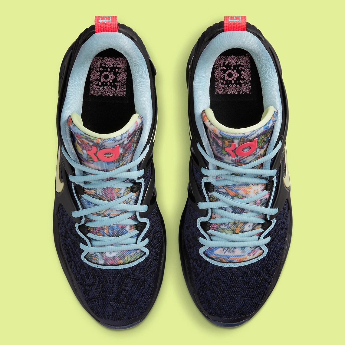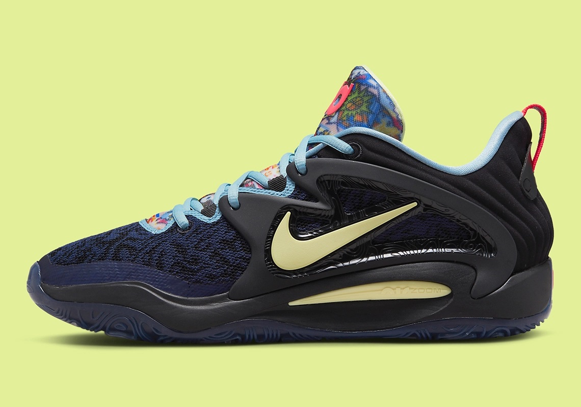 On reste sur un modèle Low mais cette fois, plus de sangle comme sur la KD 14. La tige semble quant à elle articulée entre une partie visible en mesh à l'avant, habillé par des motifs « paisley » en l'occurrence, recouverte sur l'empeigne par des matériaux plus rigides, sur lequel le « Swoosh » ressort ici en jaune sur fond noir, tandis que la partie « moulée » au niveau du talon complète l'ensemble.