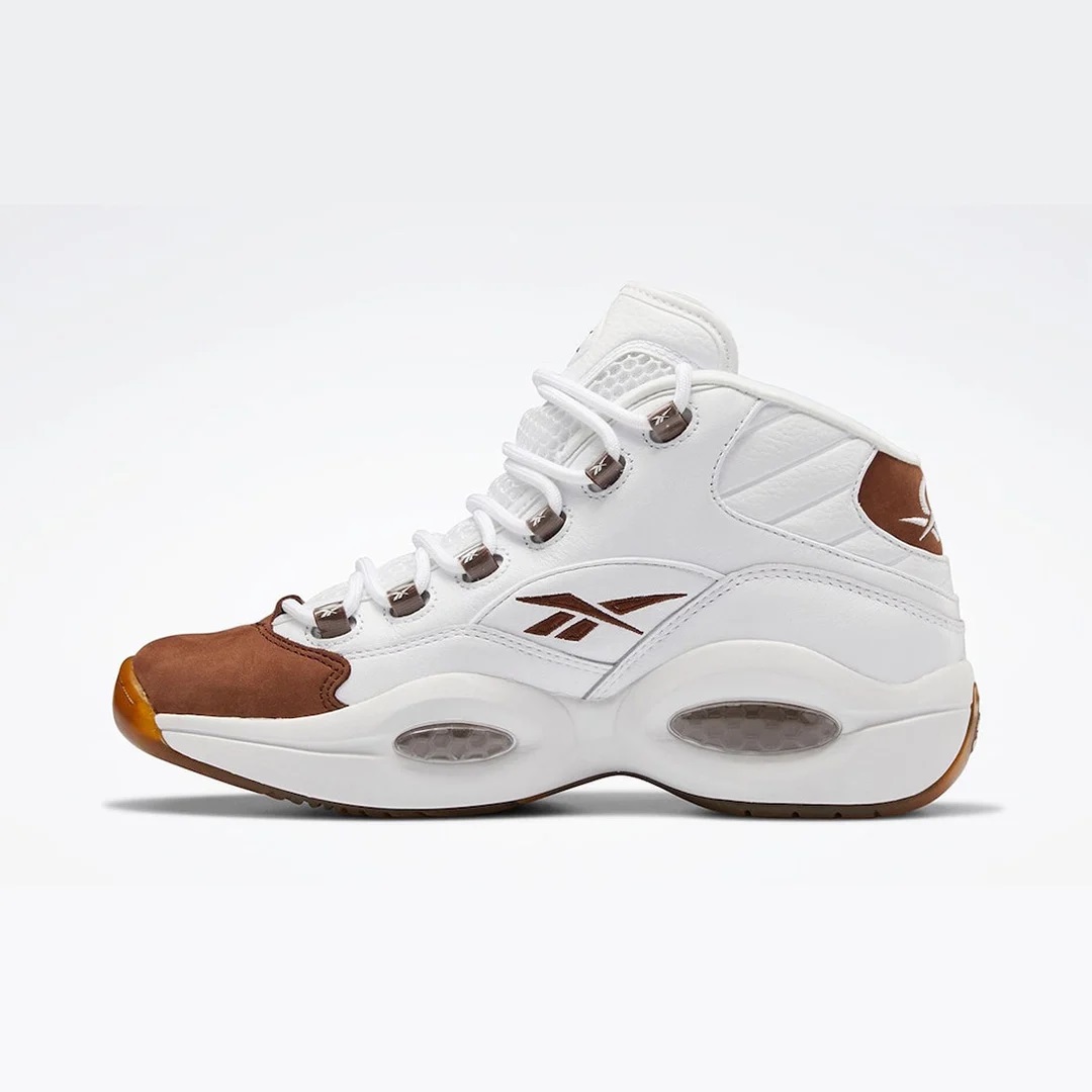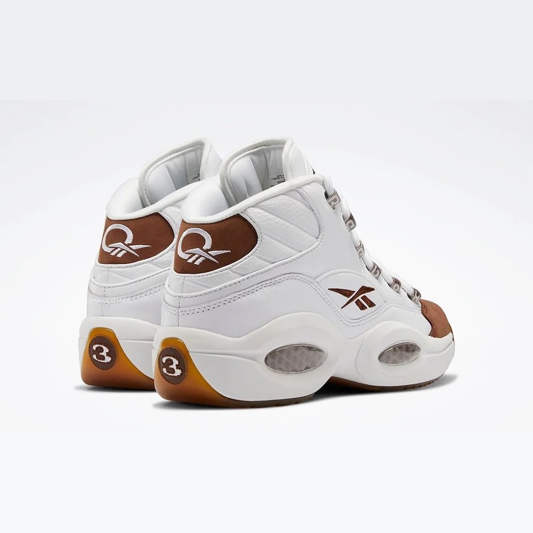 La tige en cuir blanc est assortie de touches en daim moka à l’avant de la chaussure et au niveau du talon. Le logo Reebok sur l’empeigne et les œillets ressortent de la même couleur. L’ensemble repose sur une semelle extérieure en gomme, sur laquelle le numéro 3 d’Allen Iverson figure sur le talon.