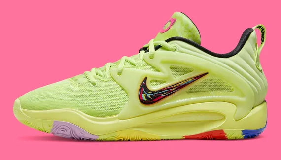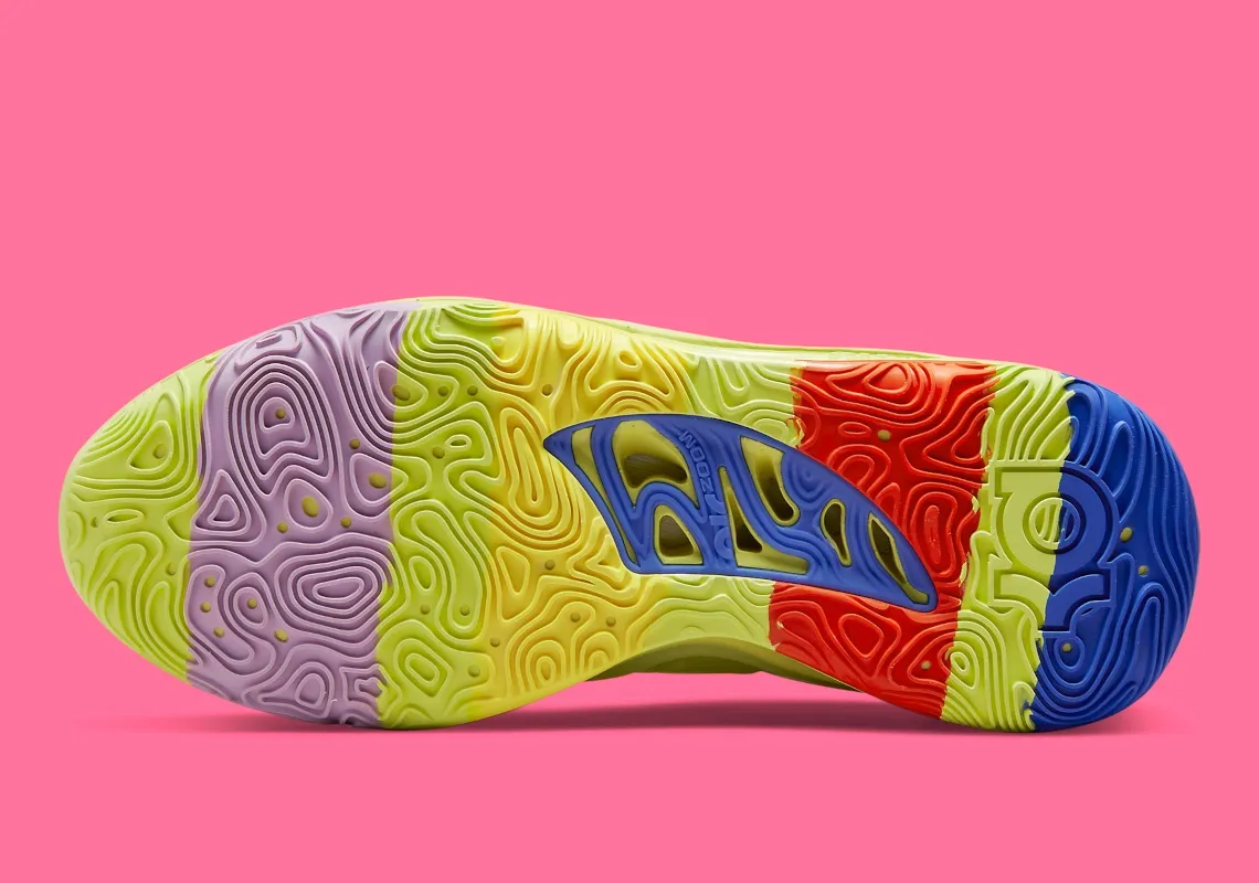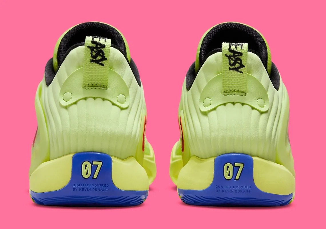 On retrouve une tige intégralement habillée de ce vert clair contrasté par un « Swoosh » multicolore et le logo KD ressortant en rose sur la languette tandis que l’intérieur du col ressort en noir. La semelle extérieure est également multicolore, allant du bleu marine au niveau du talon, sur lequel apparaît le « 07 » en vert, en passant par du rouge, du jaune et du violet.