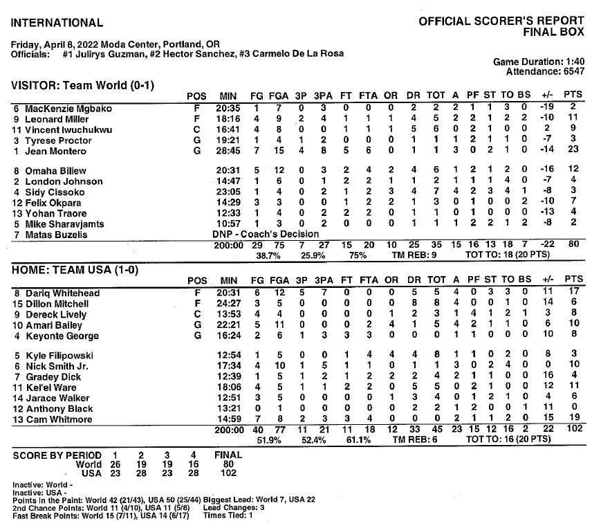 A la mi-temps, Team USA est passée devant (51-45), et la domination va se confirmer avec Whitmore qui trouve Dariq Whitehead (Duke) pour le 3-points qui donne 12 points d’avance (63-51). A l’entrée du dernier quart-temps, l’écart s’est stabilisé (74-64), et Nick Smith Jr (Arkansas) et Amari Bailey (UCLA) se chargent d’enfoncer la World Team avec un écart qui va atteindre les 22 points : 102-80.