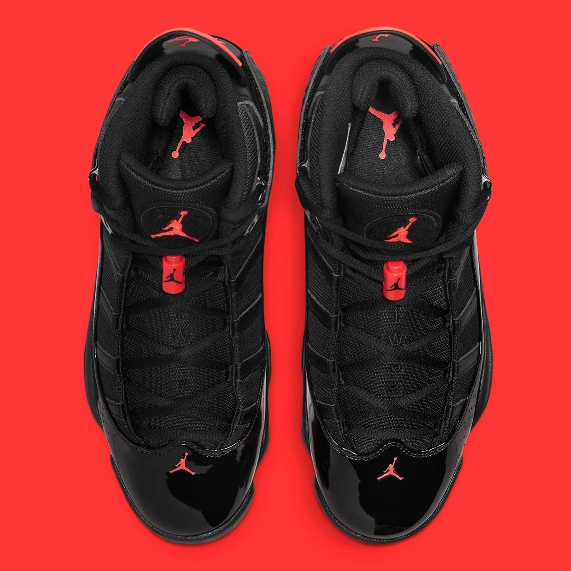 La base de la tige est en effet habillée d’un cuir verni noir en clin d’œil à la Air Jordan 11. Principalement noir, le modèle est assorti de teintes « Infrared 23 » initialement présentes sur la Air Jordan 6. L’ensemble offre un mélange « Bred » (pour « Black » et « Red ») qui vaut le détour.