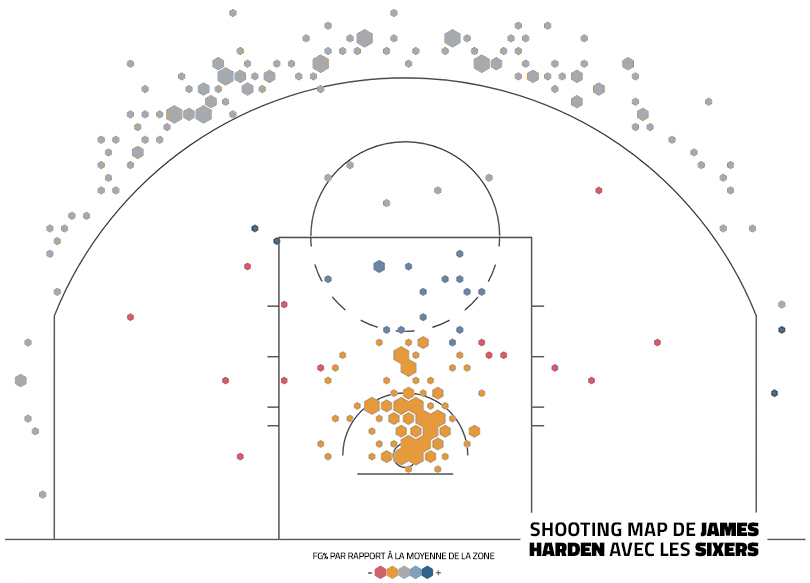 S’il provoque toujours pas mal de lancers-francs, “The Beard” est par contre beaucoup moins efficace dans la peinture que dans ses meilleures années. Depuis son arrivée à Philadelphie, il ne tourne ainsi qu’à 55.7% de réussite sous le cercle, contre 62.4% lors de sa saison de MVP par exemple. Il se fait également beaucoup plus contrer puisque 20% de ses tirs sont rejetés avec les Sixers, contre seulement 15% lors de la saison 2017/18.