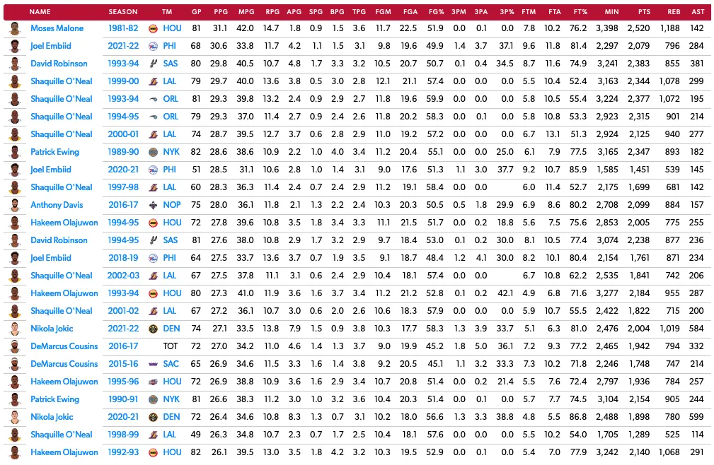 D'ailleurs, seuls cinq pivots ont atteint cette moyenne dans l'histoire : Wilt Chamberlain (7 fois), Kareem Abdul-Jabbar (x3), Bob McAdoo (x3) Walt Bellamy (x1) et donc Moses Malone (x1). David Robinson (29.8) n'était pas très loin en 1993/94, et Shaquille O'Neal l'aurait sans doute dépassé plusieurs fois, s'il avait été plus adroit aux lancers.