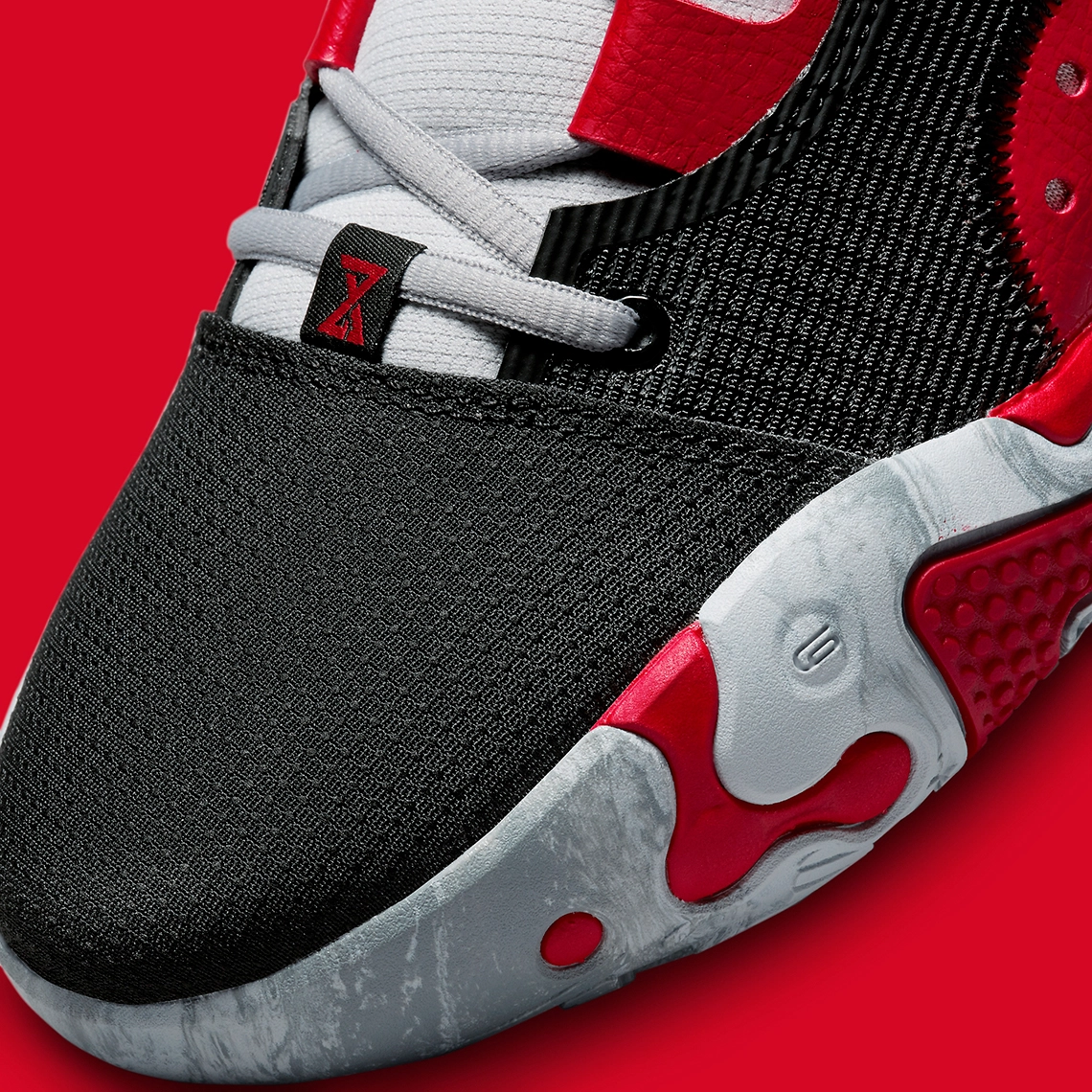 On retrouve cette fois une tige majoritairement noire, assortie de « demi-cercles » et d’œillets en rouge. Le haut du col est également en rouge. La petite particularité se situe dans les touches de gris présent sur la languette et l’une des virgules. La semelle ressort également en gris « marbré » et rouge.