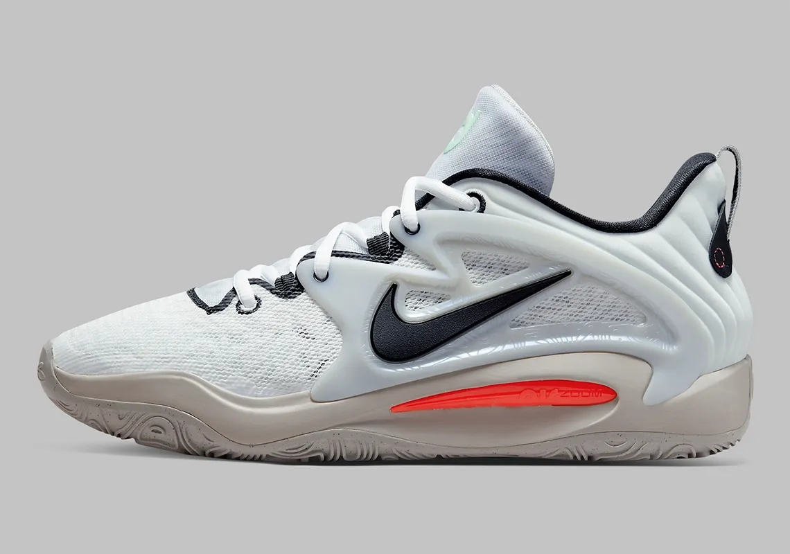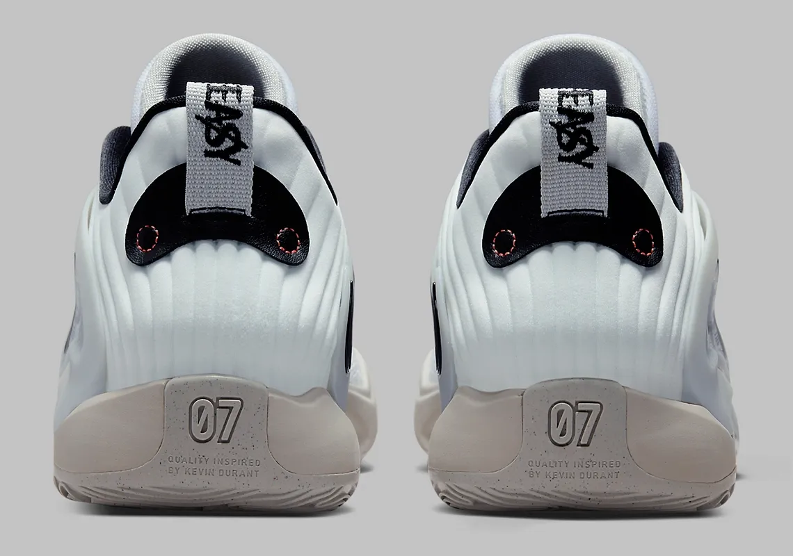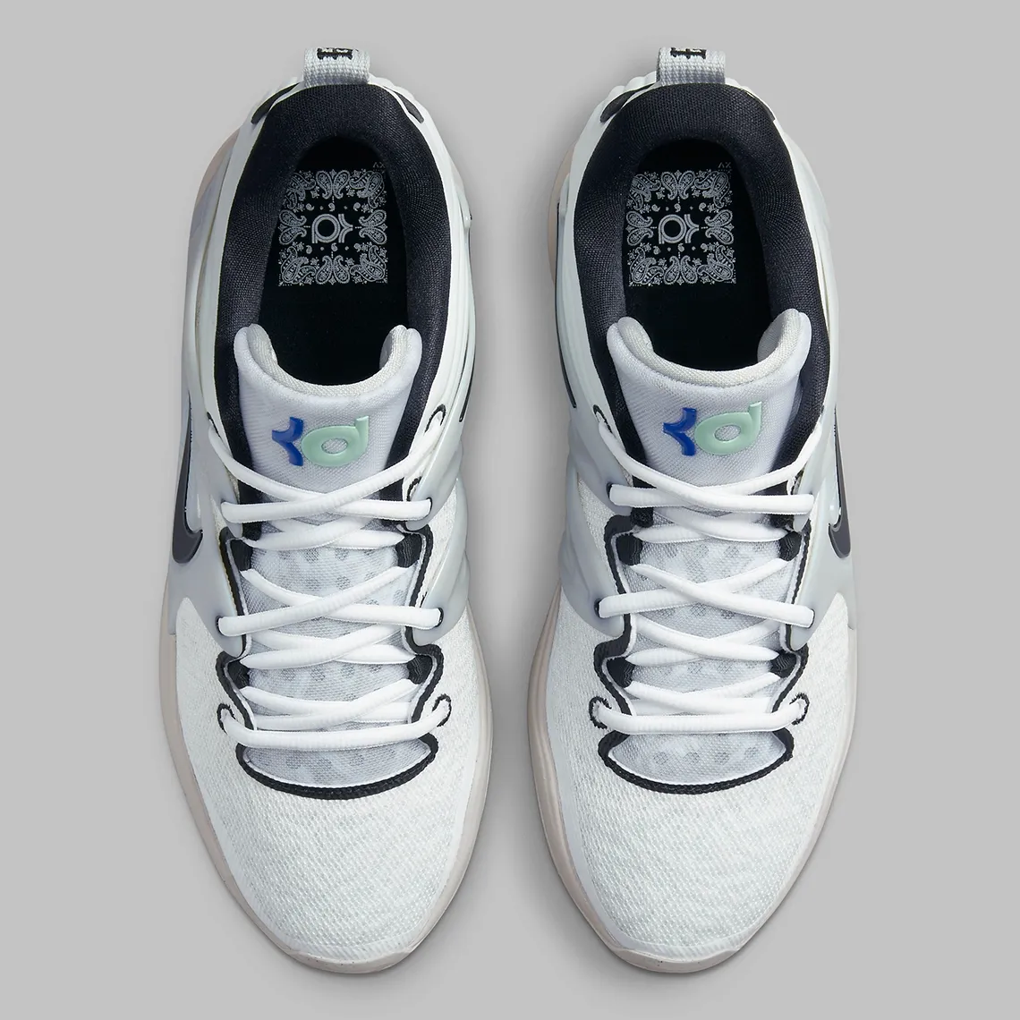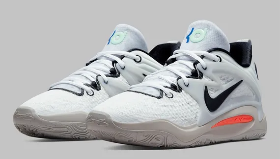 Dernière déclinaison en date, cette version visiblement inspirée des couleurs des Nets, avec un « swoosh » et le col intérieur en noir pour accompagner une tige mêlant blanc et gris. L’ensemble repose sur une semelle couleur « tan », tandis que le logo « KD » apparaît en bleu et vert sur la languette.