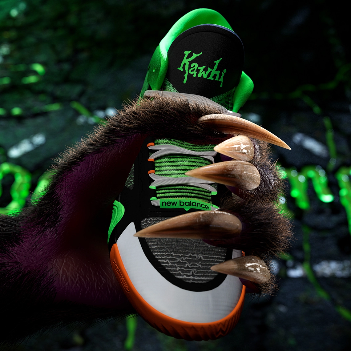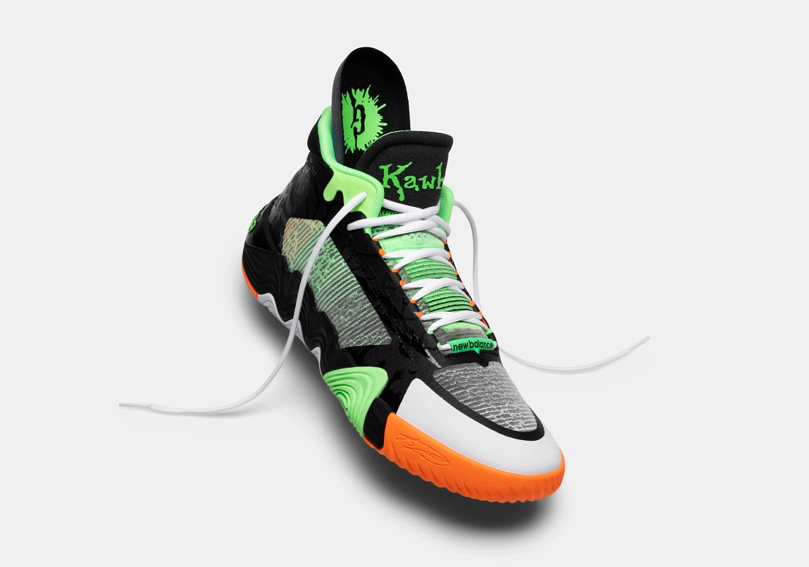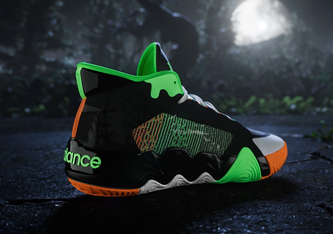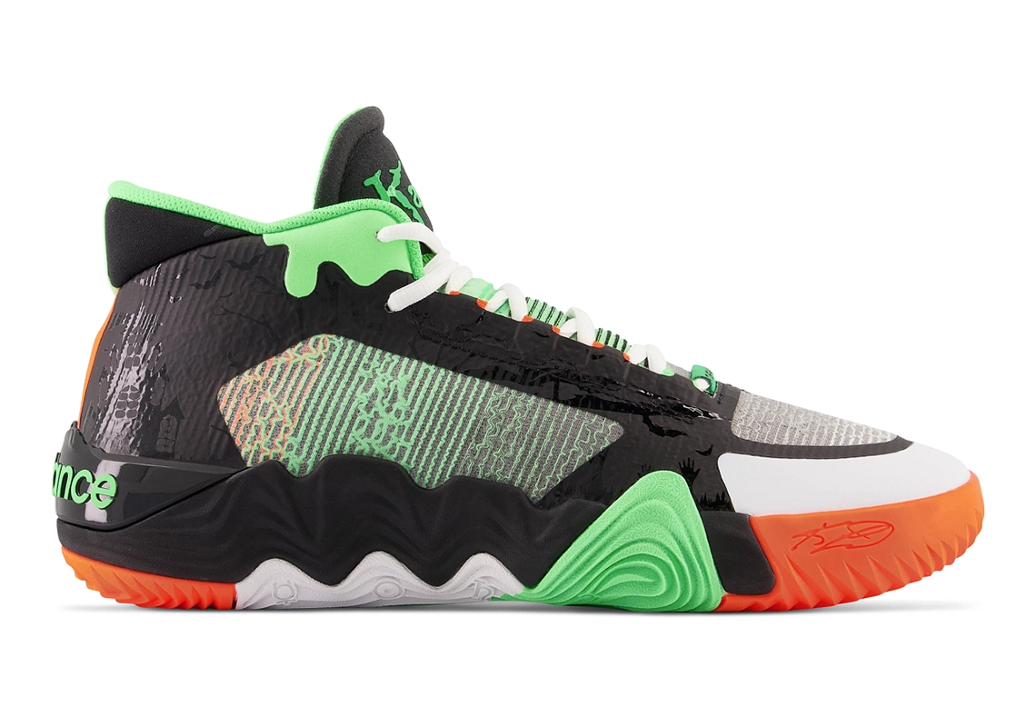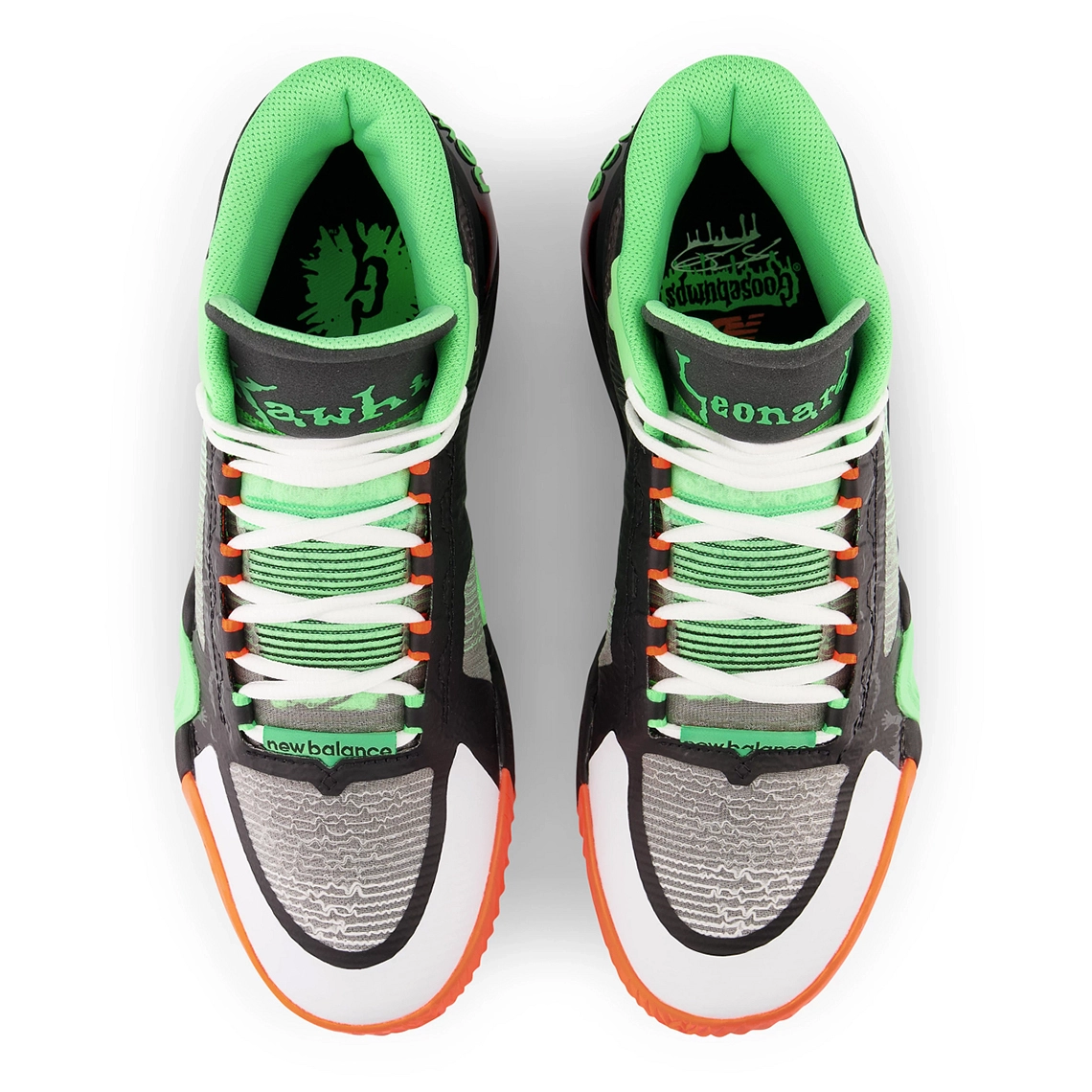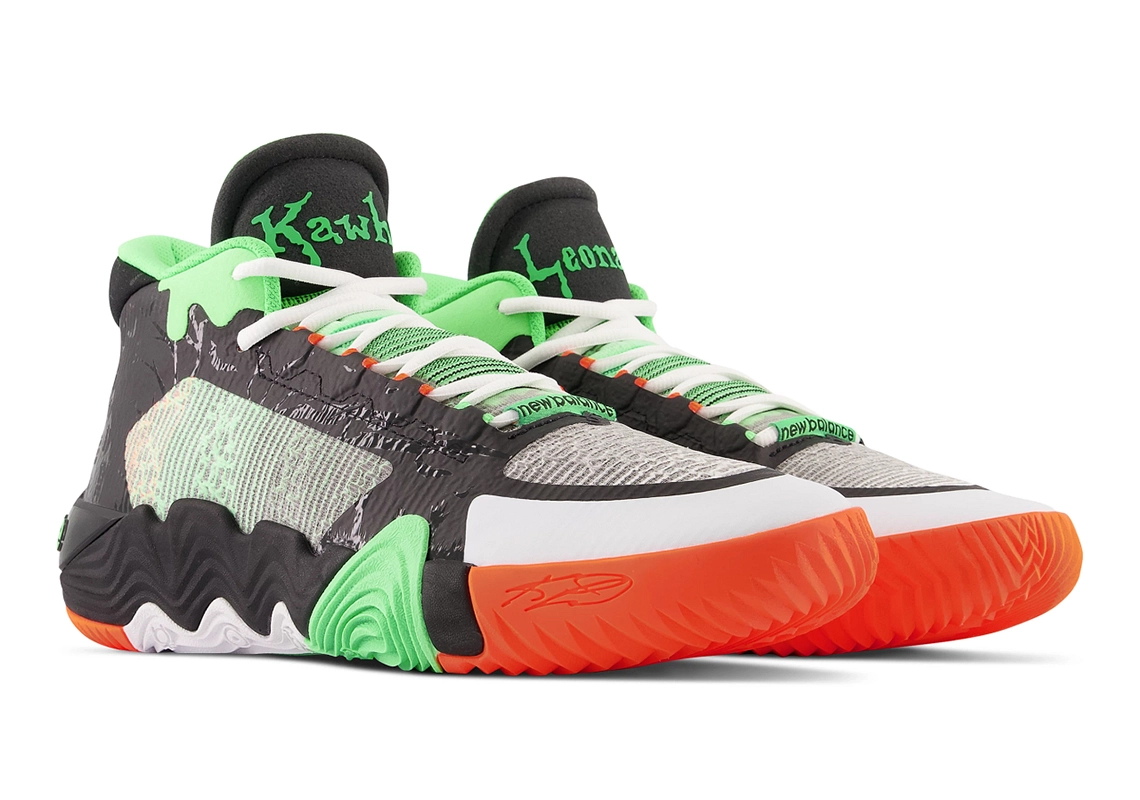 On retrouve ainsi la même typographie que celle utilisée pour la collection de livres au niveau de l’inscription « Kawhi » et Leonard » présent sur les languettes. Pour ce qui est des couleurs, la tige allie du noir et du gris, et l’ensemble est contrasté par des touches d’orange sur la semelle extérieure et de vert clair notamment sur le haut du col et la languette. L’inscription “New Balance”, le 2 et le “II” ressortent aussi en vert au niveau du talon. De nombreux détails font également référence au côté “terrifiant” de la saga “Chair de poule”.