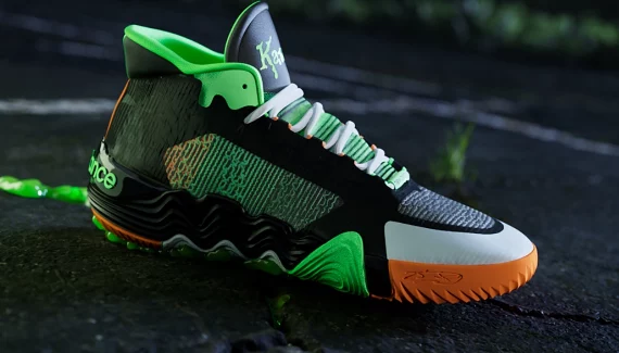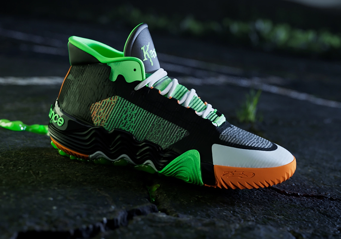 On retrouve ainsi la même typographie que celle utilisée pour la collection de livres au niveau de l’inscription « Kawhi » et Leonard » présent sur les languettes. Pour ce qui est des couleurs, la tige allie du noir et du gris, et l’ensemble est contrasté par des touches d’orange sur la semelle extérieure et de vert clair notamment sur le haut du col et la languette. L’inscription “New Balance”, le 2 et le “II” ressortent aussi en vert au niveau du talon. De nombreux détails font également référence au côté “terrifiant” de la saga “Chair de poule”.