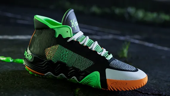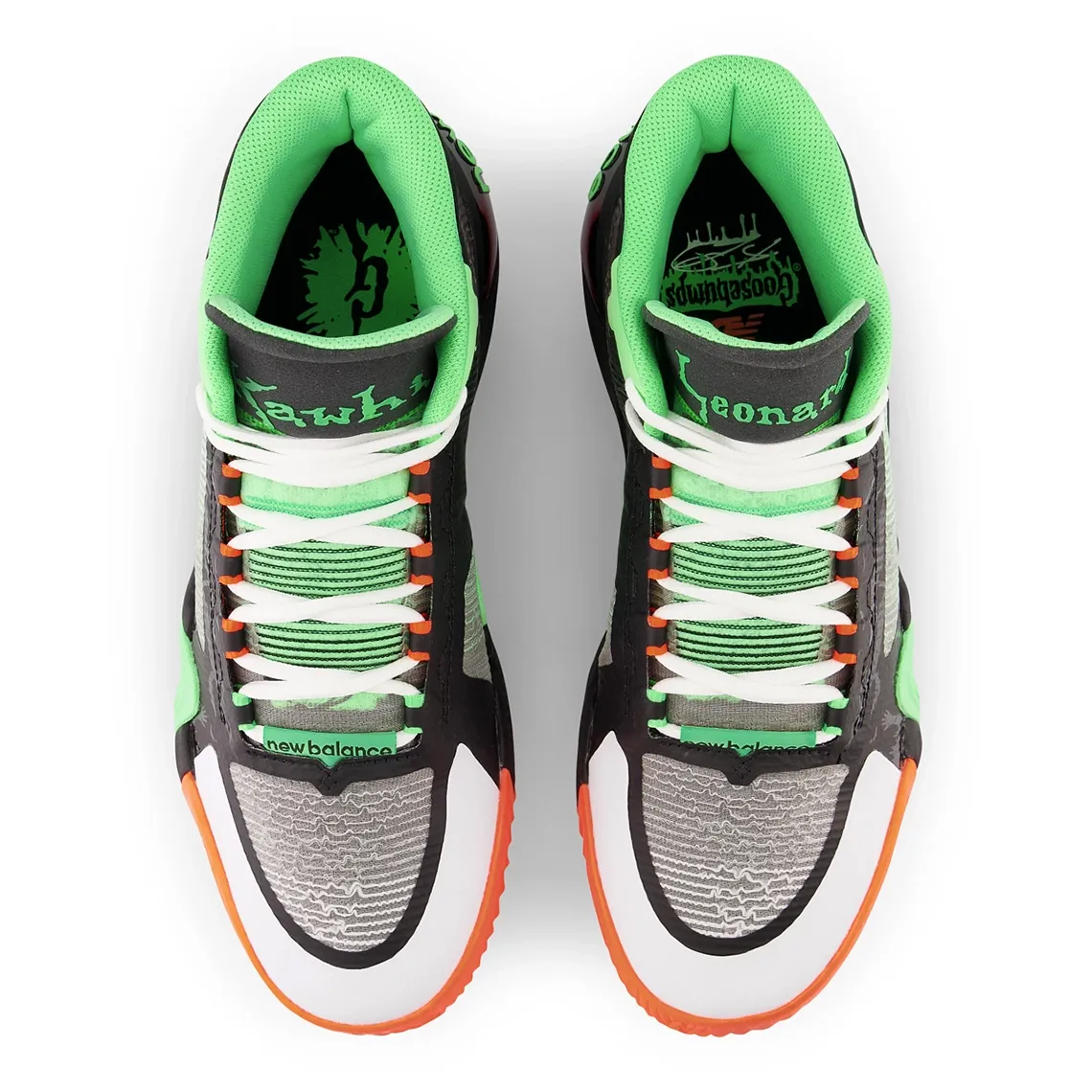 On retrouve ainsi la même typographie que celle utilisée pour la collection de livres au niveau de l’inscription « Kawhi » et Leonard » présent sur les languettes. Pour ce qui est des couleurs, la tige allie du noir et du gris, et l’ensemble est contrasté par des touches d’orange sur la semelle extérieure et de vert clair notamment sur le haut du col et la languette. L'inscription “New Balance”, le 2 et le “II” ressortent aussi en vert au niveau du talon. De nombreux détails font également référence au côté “terrifiant” de la saga “Chair de poule”.