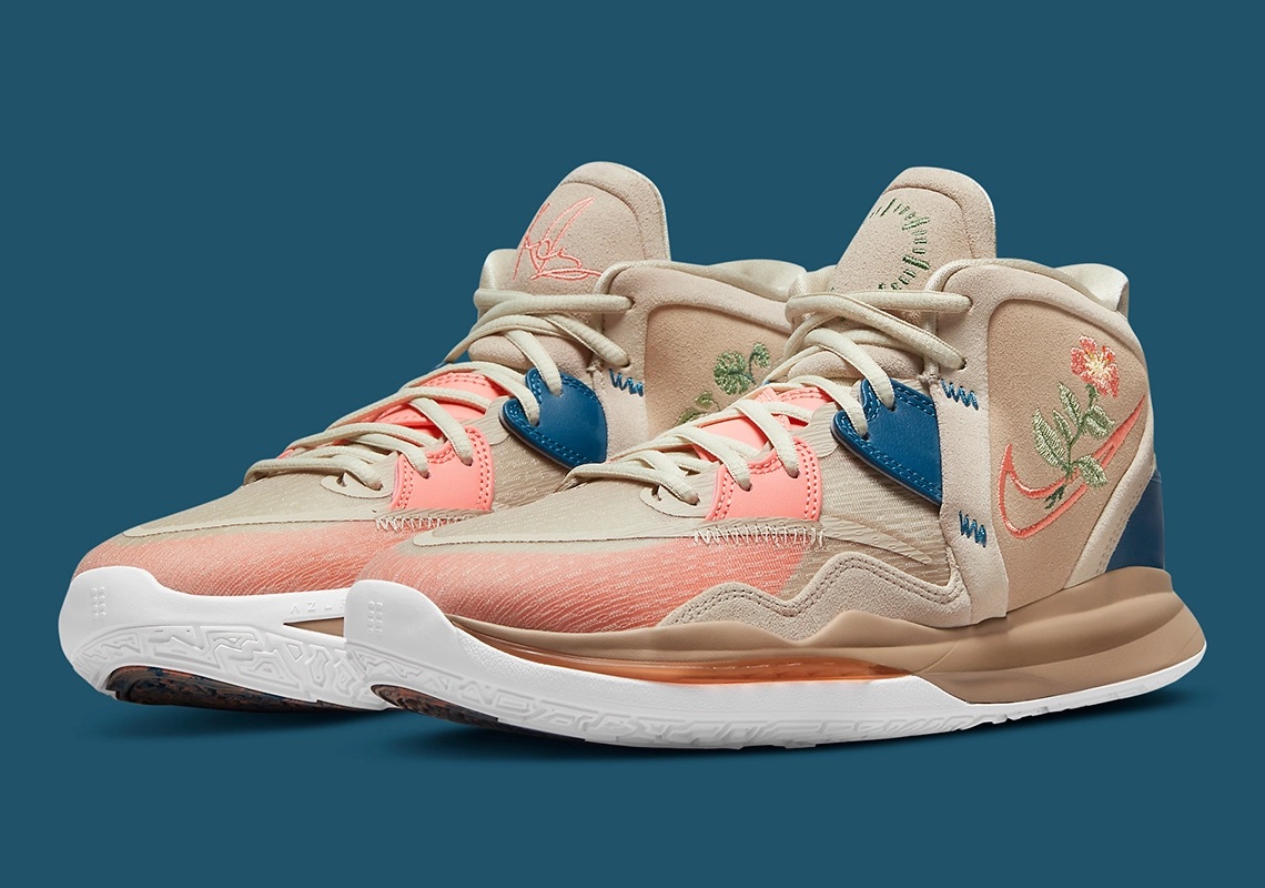 Nike assure également le tempo en multipliant les nouveaux coloris de la Kyrie 8 « Infinity », avec cette fois une nouvelle version assortie de broderies florales.