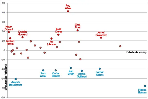 Surprise, c'est Ray Allen qui s'améliore le plus (+41 %). Du côté des plus grosses baisses, c'est Nicolas Batum qui décroche la timbale (-37,9 %). Le Français a connu une série difficile face à Dallas avec une adresse en berne et une utilisation réduite, à cause de la bonne forme de Gerald Wallace.Amar'e Stoudemire est lui aussi en très fort déclin (-30.6 %) mais l'intérieur des Knicks était blessé, ce qui explique pas mal de choses. En plus de sa faible utilisation, Carlos Boozer est lui moins efficace. Tout comme Pau Gasol et Lamar Odom. Ou encore Josh Smith, qui subit sans doute les effets de la forte utilisation de Joe Johnson ou Jamal Crawford. Car moins on touche de ballons, plus il est difficile d'être efficace. Un effet logique à prendre aussi en compte.