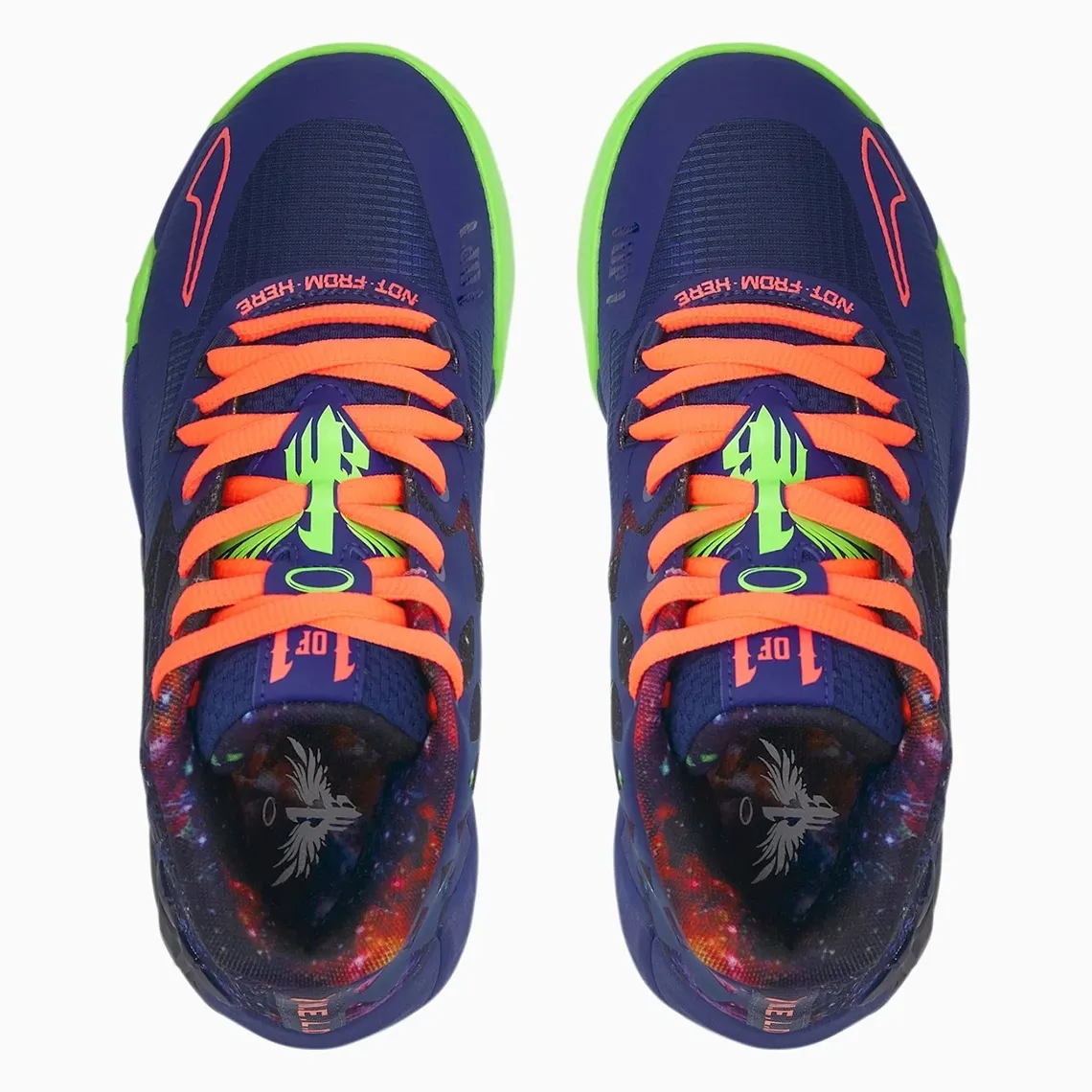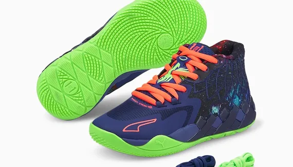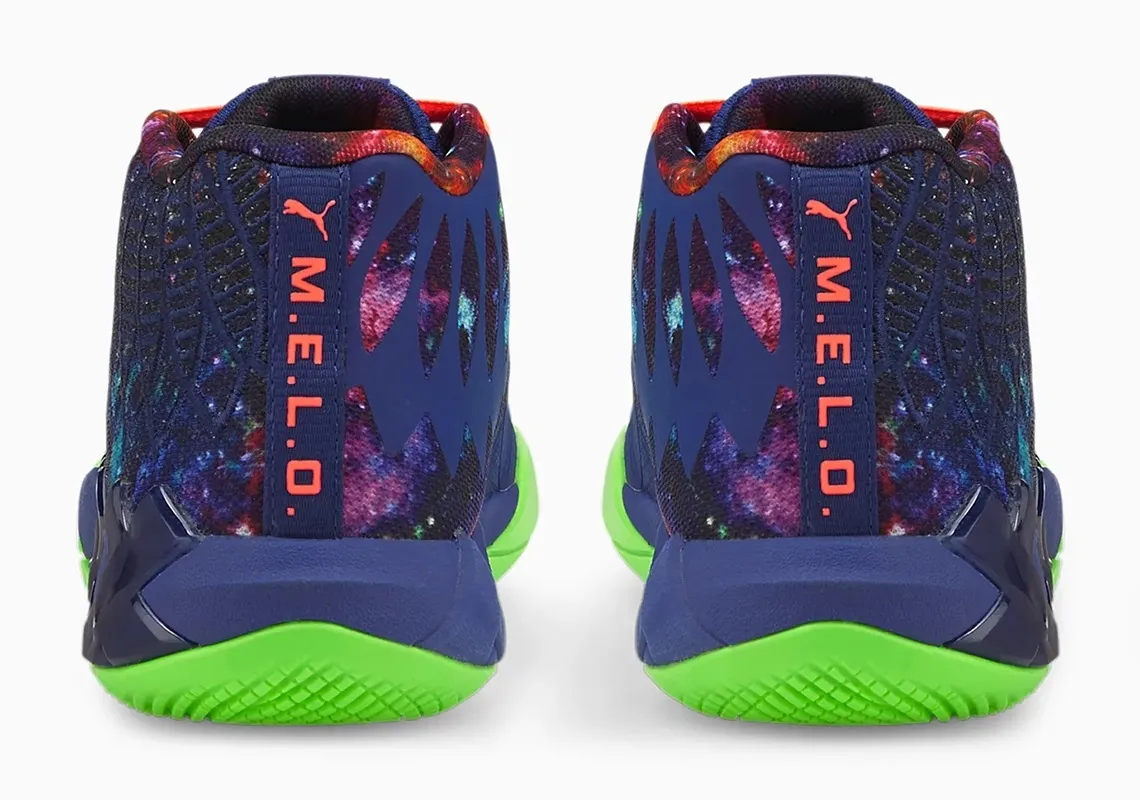 Puisque le meneur des Hornets vient d'ailleurs, Puma a dévoilé un coloris « Galaxy » aux teintes bleu marine et doté d'un motif « spatial » sur la partie en mesh de la tige, le même que celui présent sur la boîte de la MB.01. Les lacets et finitions en orange et la semelle extérieure en vert-clair complètent l'ensemble.