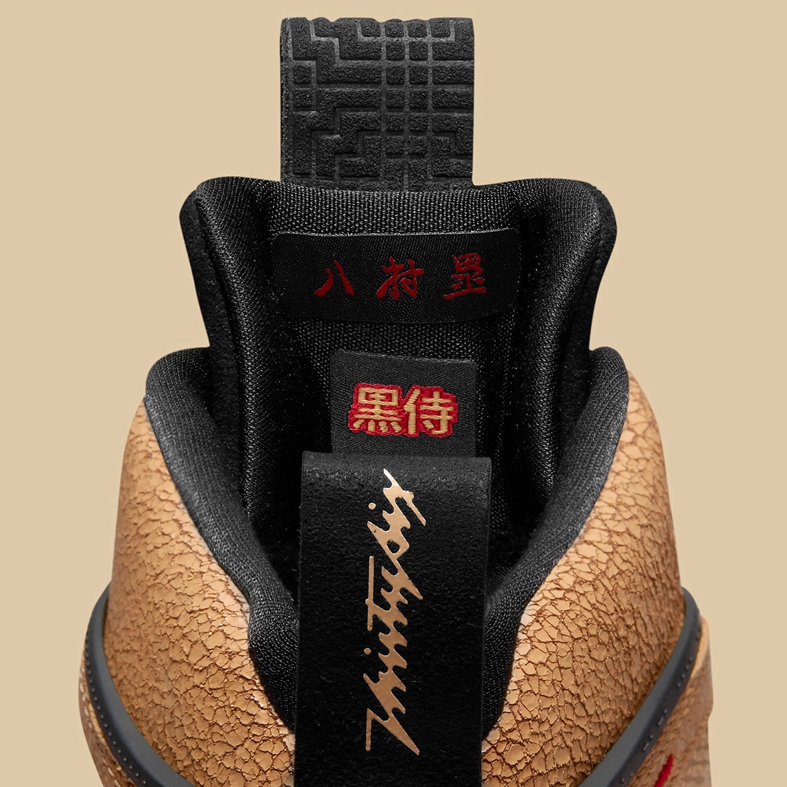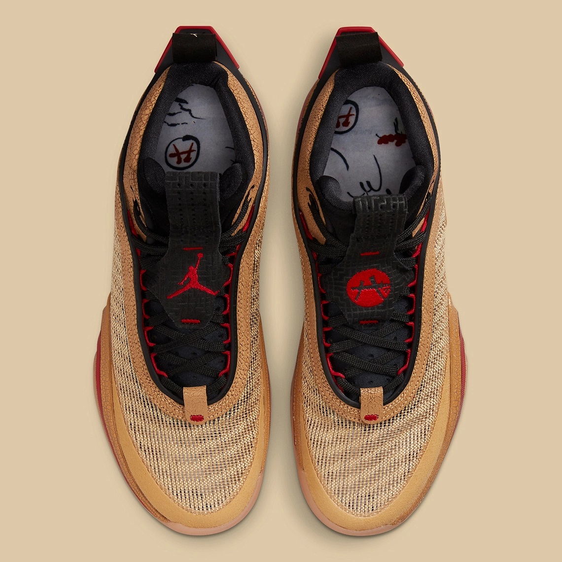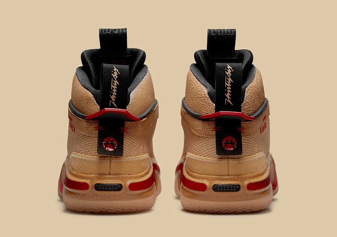 La languette et les lacets ressortent en noir, recouverts d’un « Jumpman » rouge sur la chaussure droite, et du logo de Rui Hachimura, également présent au niveau du talon, sur la chaussure gauche.